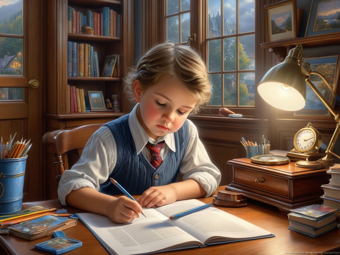 A young woman in a cozy library setting studies intently, writing in a notebook. Sunlight streams through large windows, illuminating shelves of books and a globe nearby.