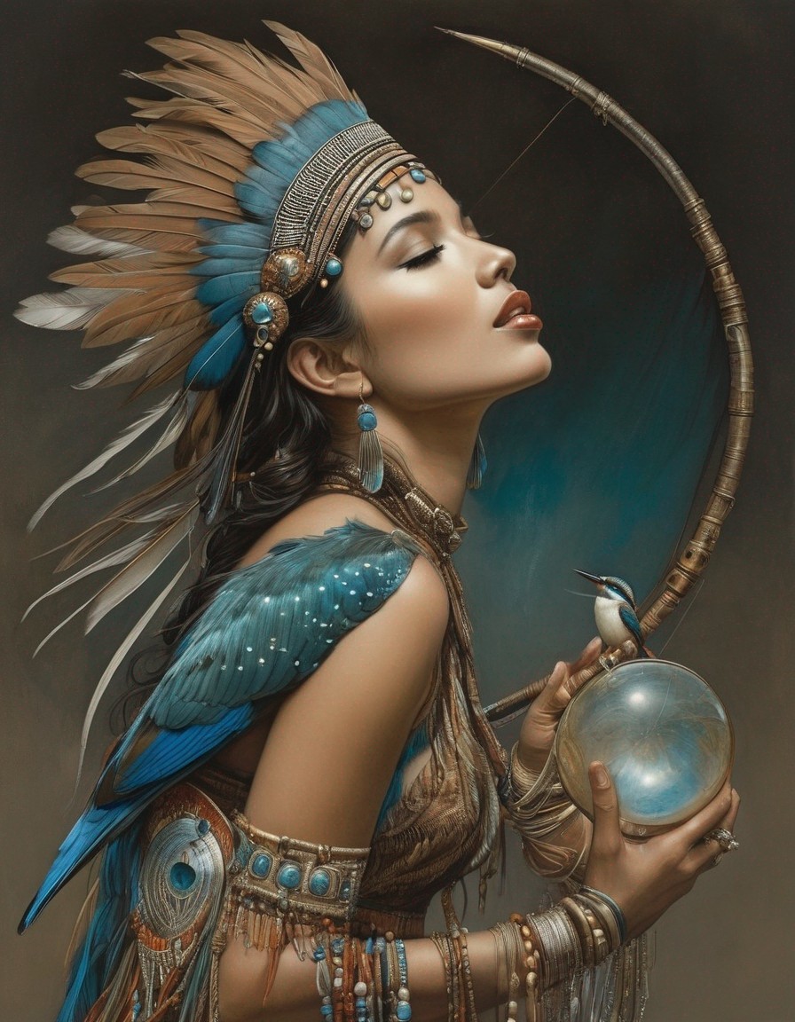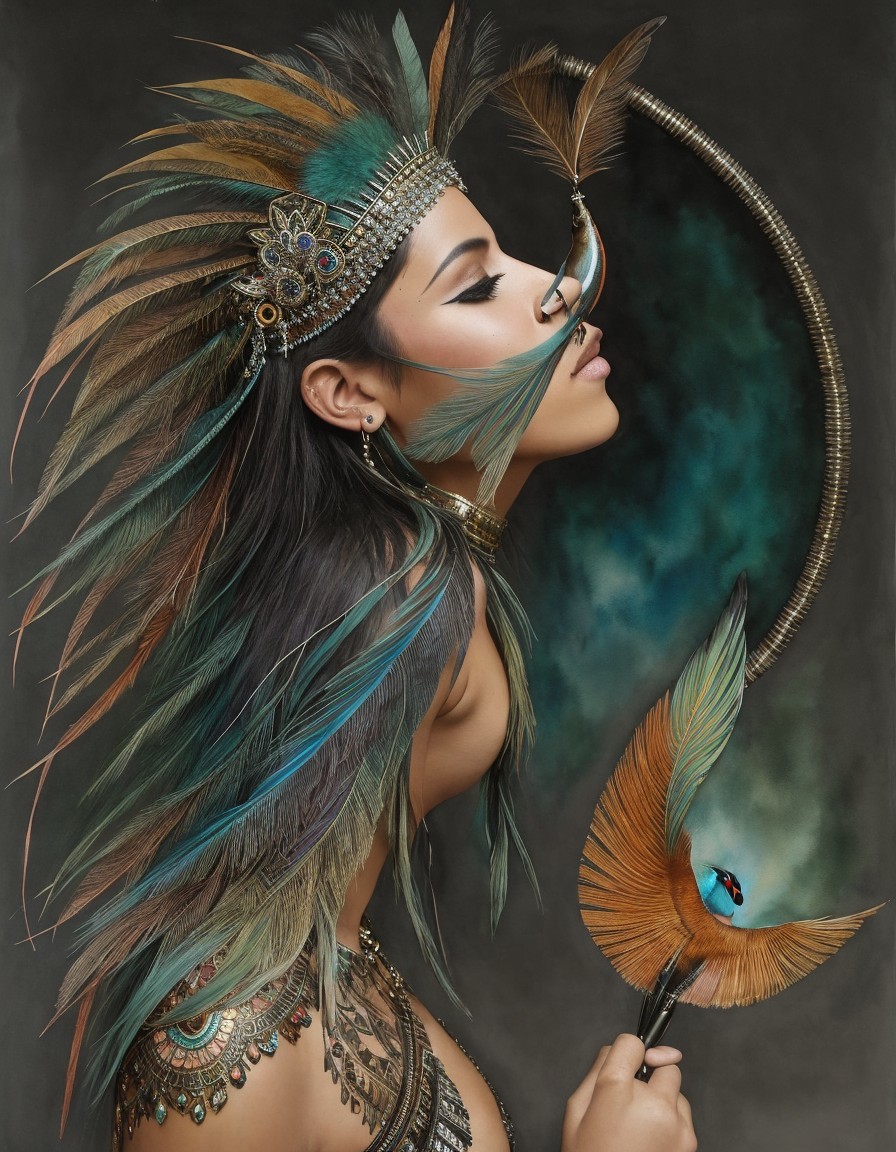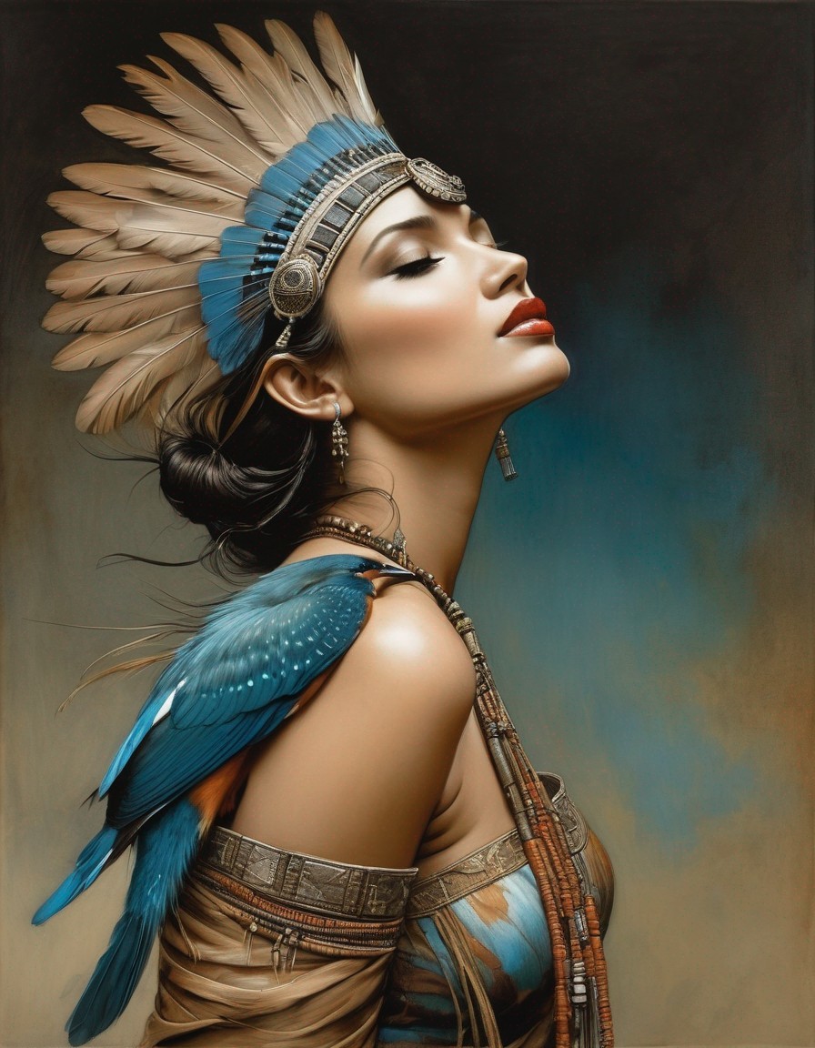 A painting of a woman with feather headdress, ruffled collar, beaded necklaces, and contemplative gaze.