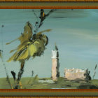The painting features a large yellow squash blossom against a serene desert landscape, with cacti in the foreground and a setting sun illuminating distant mountains. The style is calm and surreal.