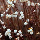 A close-up view of a branch adorned with clusters of tiny, white, spherical flowers. Some leaves show hints of yellow and green, creating a vibrant contrast against the delicate blossoms.