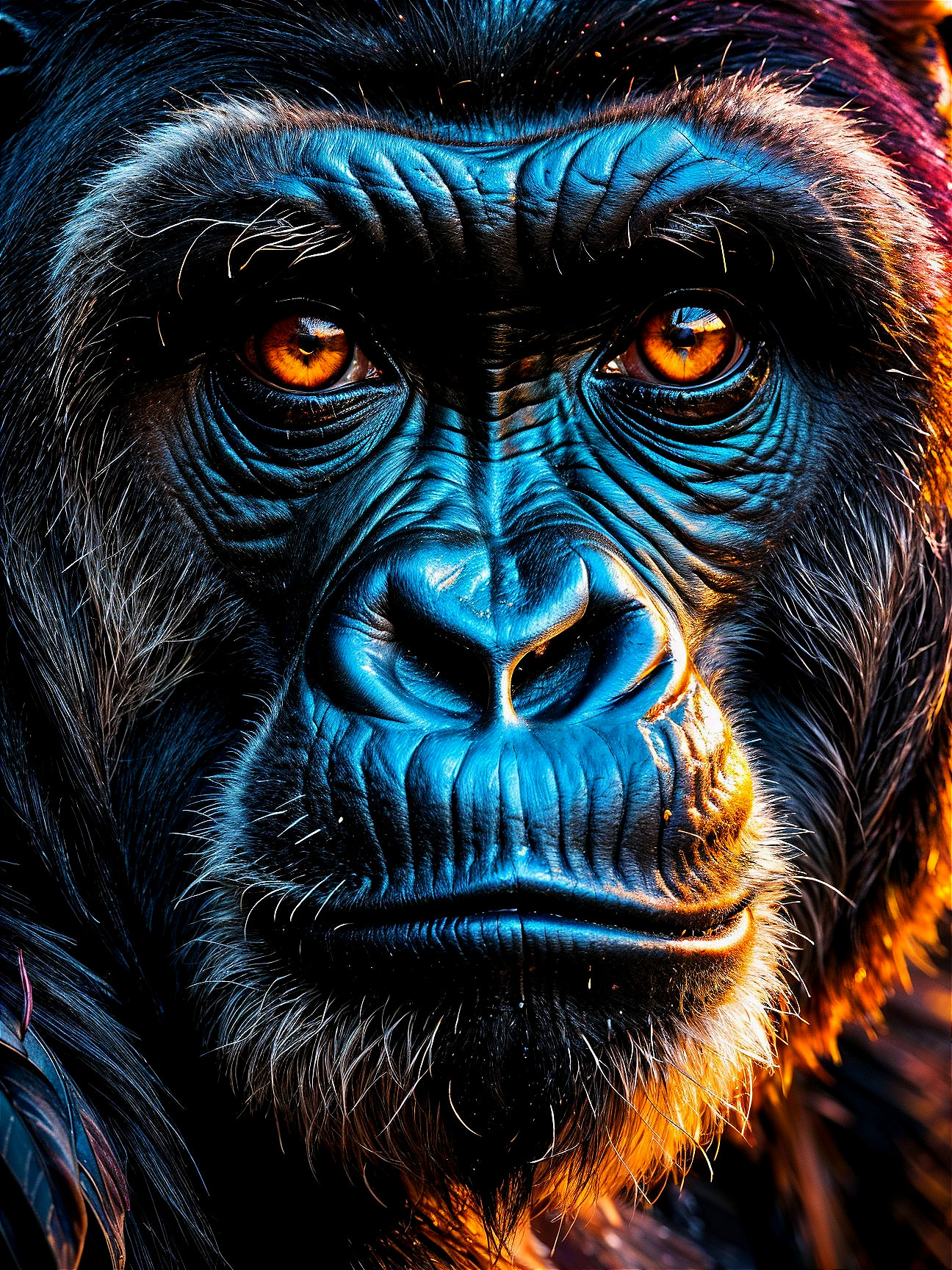 A striking close-up of a gorilla's face, showcasing its deep, expressive eyes and textured fur. The lighting enhances its features, creating a dramatic and captivating portrait.