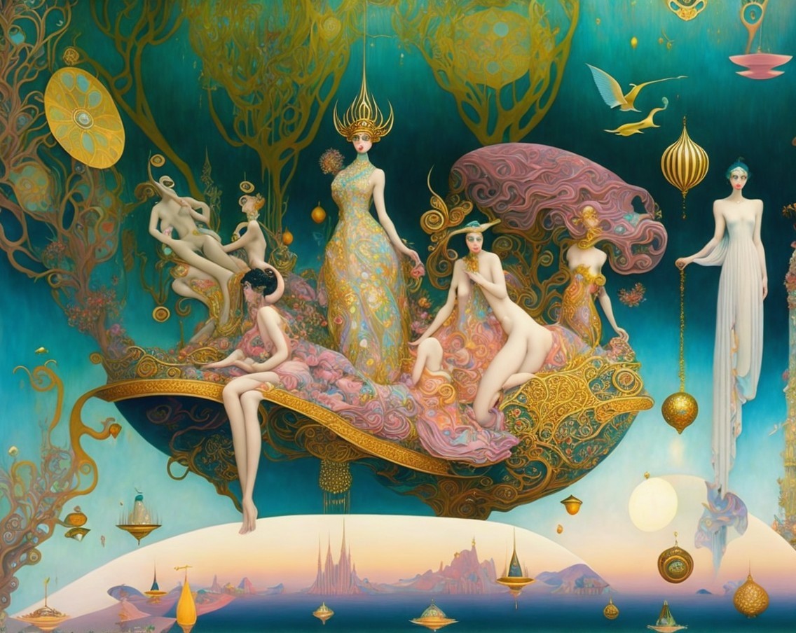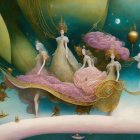 The image features five ethereal figures dressed in ornate gowns, surrounded by whimsical elements like butterflies and floating lanterns. The color palette is vibrant, blending blues and golds.