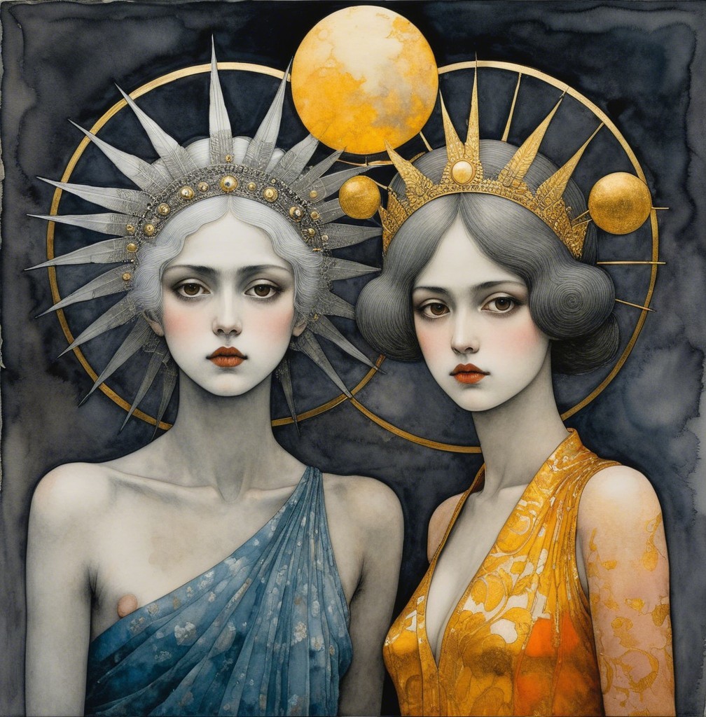 Two ethereal women stand together, one in a flowing gray garment and the other in a vibrant yellow, framed by a celestial backdrop with a golden sun, exuding a mystical, dreamlike aura.