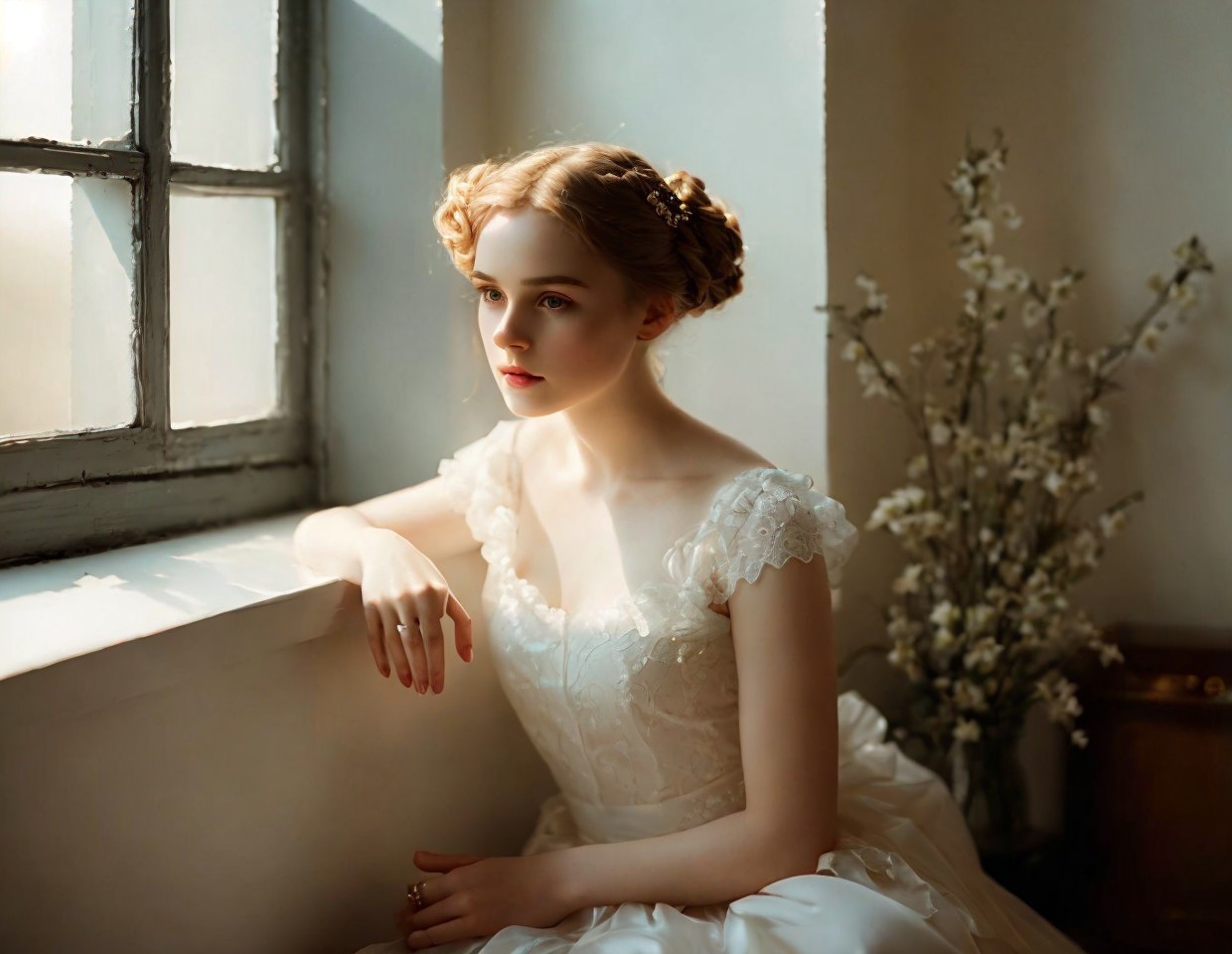 A young woman in a delicate white dress sits by a sunlit window, her hair styled in elegant curls. She gazes thoughtfully, surrounded by soft natural light and subtle floral decor.
