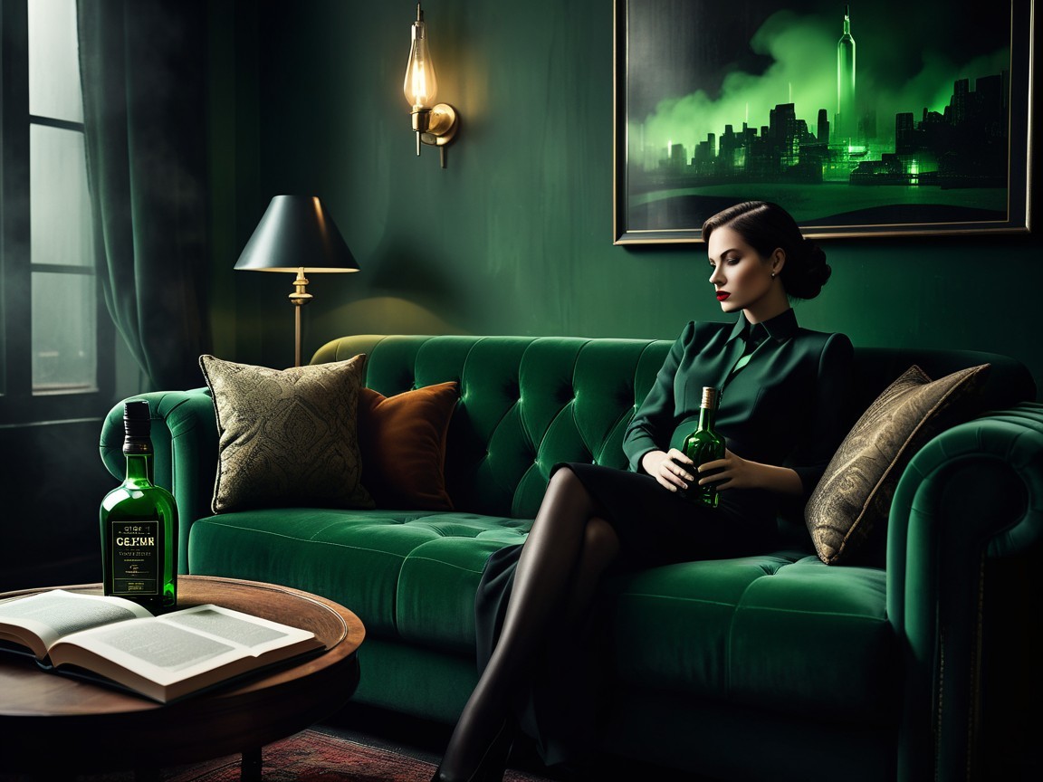 relaxing melancholy on a sofa with an art book in a room with a chic, noir novel-like interior that looks warm on a cold day. One green bottle of very smoky tasting scotch. enigmatic, mystical, mysterious* extremely detailed background* moody atmosphere, gloomy, mysterious* *Leka highly detailed textures*Retro-futuristic Rule 63. Double exposure. Tamara de Lempicka, Emma Vieceli. Pastels detailed gothic attire, Hieronymus Bosch style, Antonio Mora, Patrice Murciano, large striking eyes, metaphysical art, close-up, by Winslow Homer, Paul Gauguin, Turner trending on Artstation digital painting elegant intricate very attractive beautiful award winning ultra detailed crisp quality Unreal Engine magical Paul Klee gorgeous Egon Schiele celestial alcohol ink Jessica Rossier