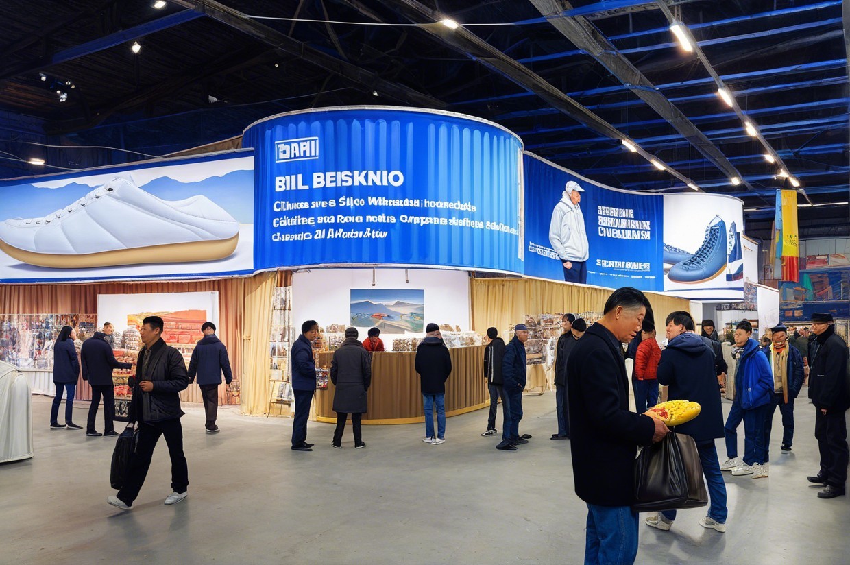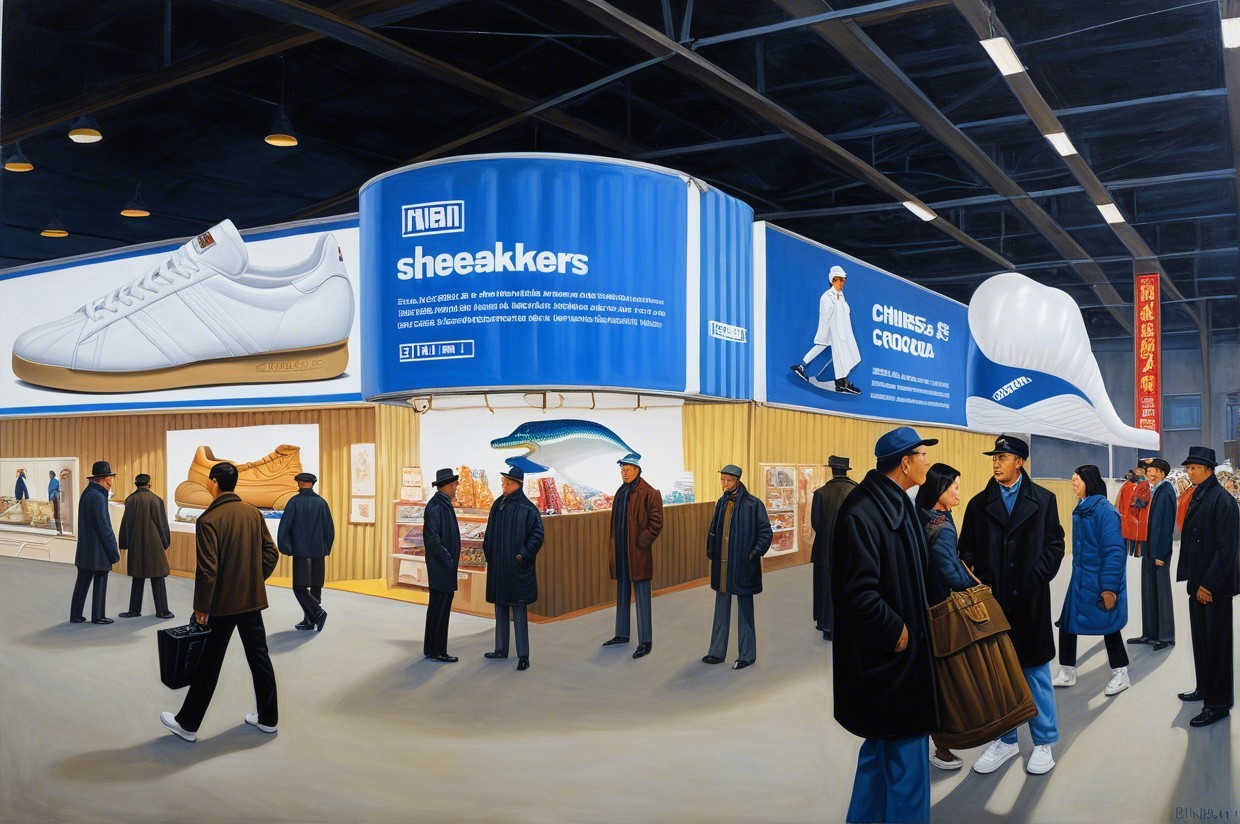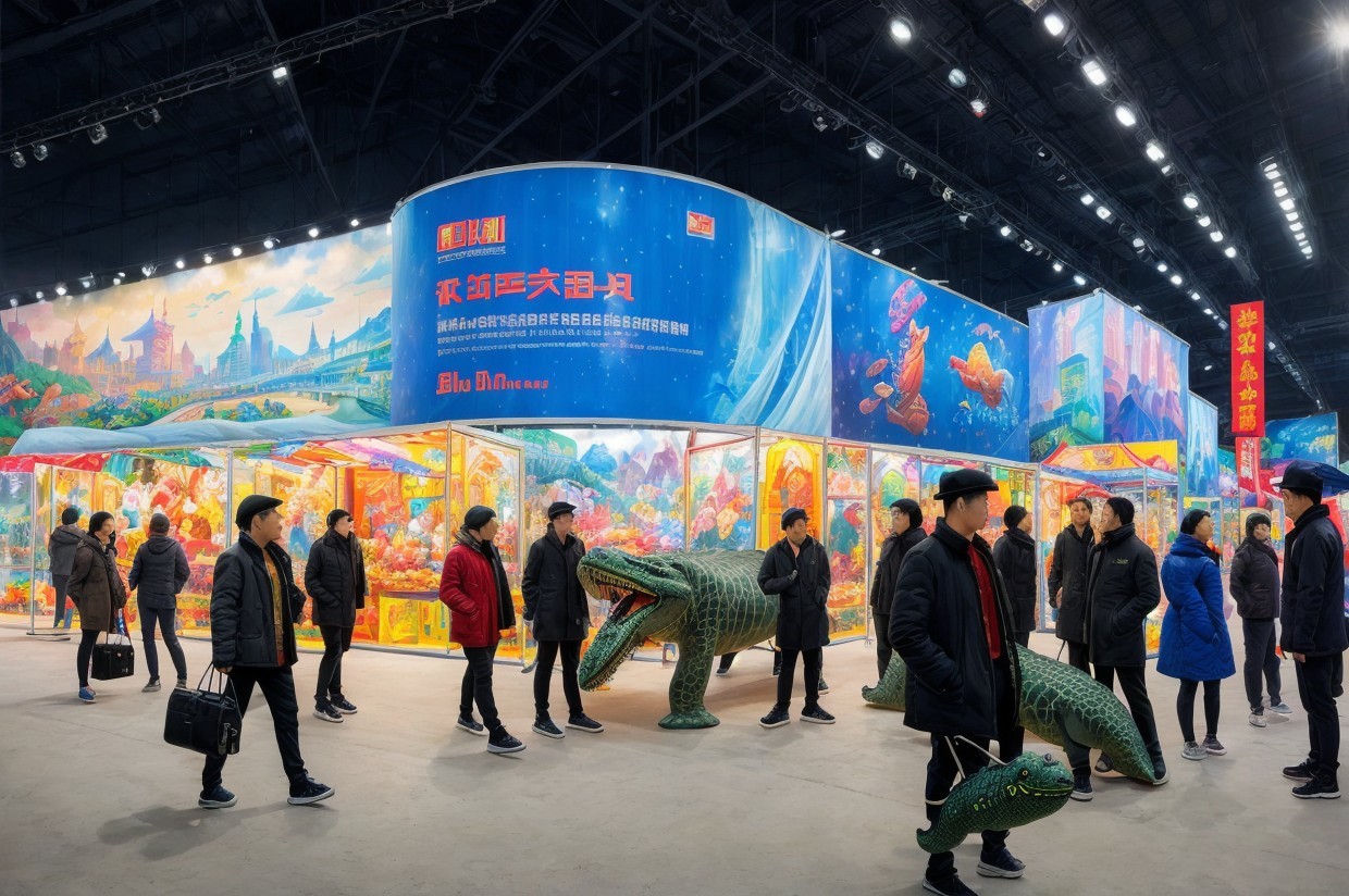 The scene depicts a bustling exhibition hall with crowds of people in formal attire, showcasing large, colorful inflatable crocodiles and promotional banners, creating an atmosphere of commerce and excitement.