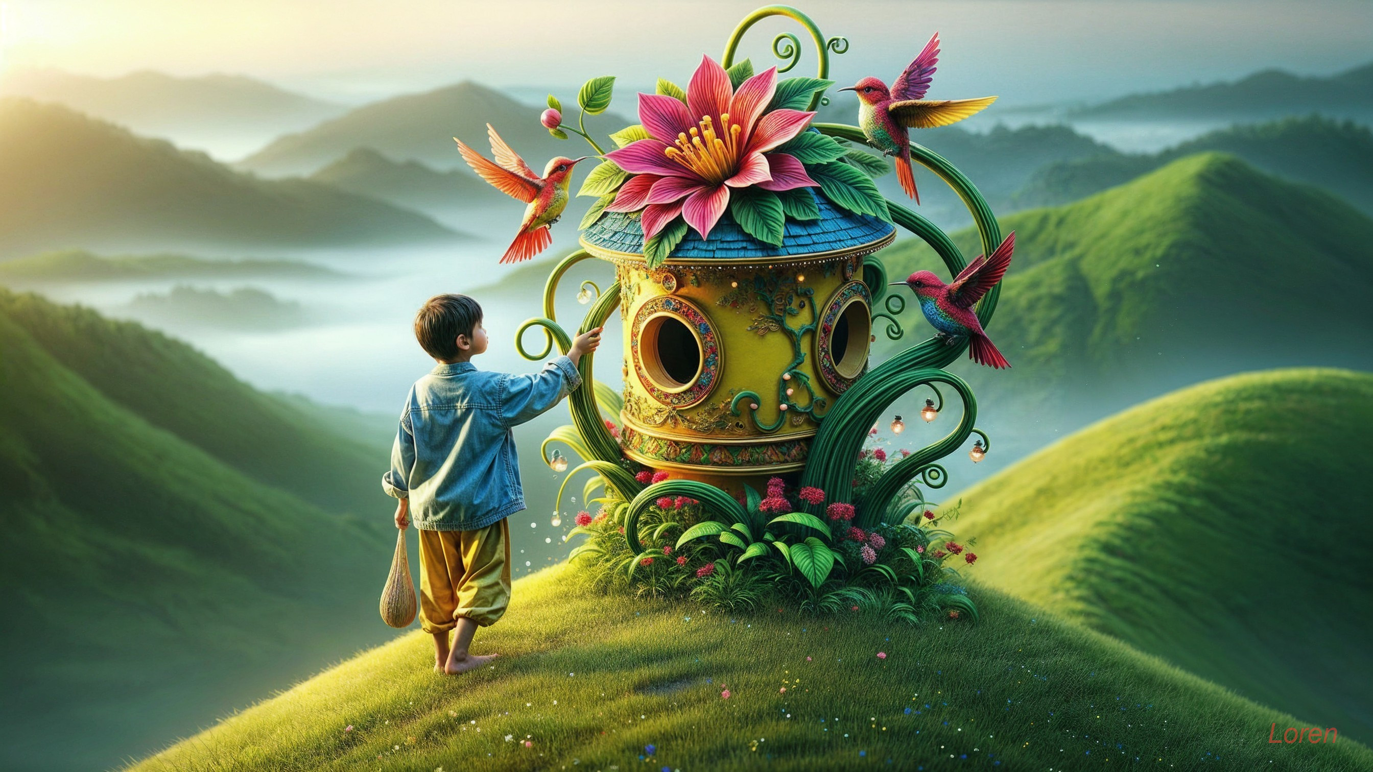 A child gently approaches a vibrant, flower-adorned structure amidst lush green hills, with colorful birds fluttering around, creating a magical, enchanted atmosphere.