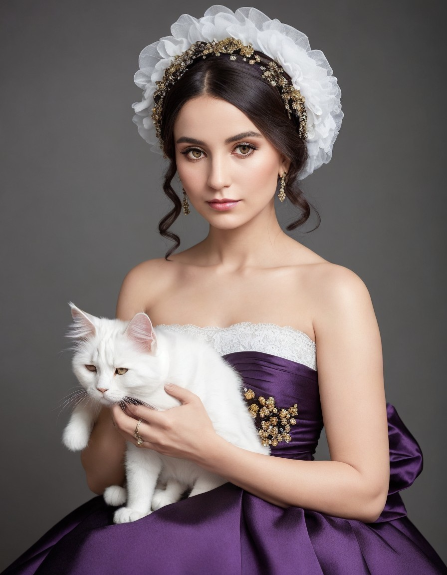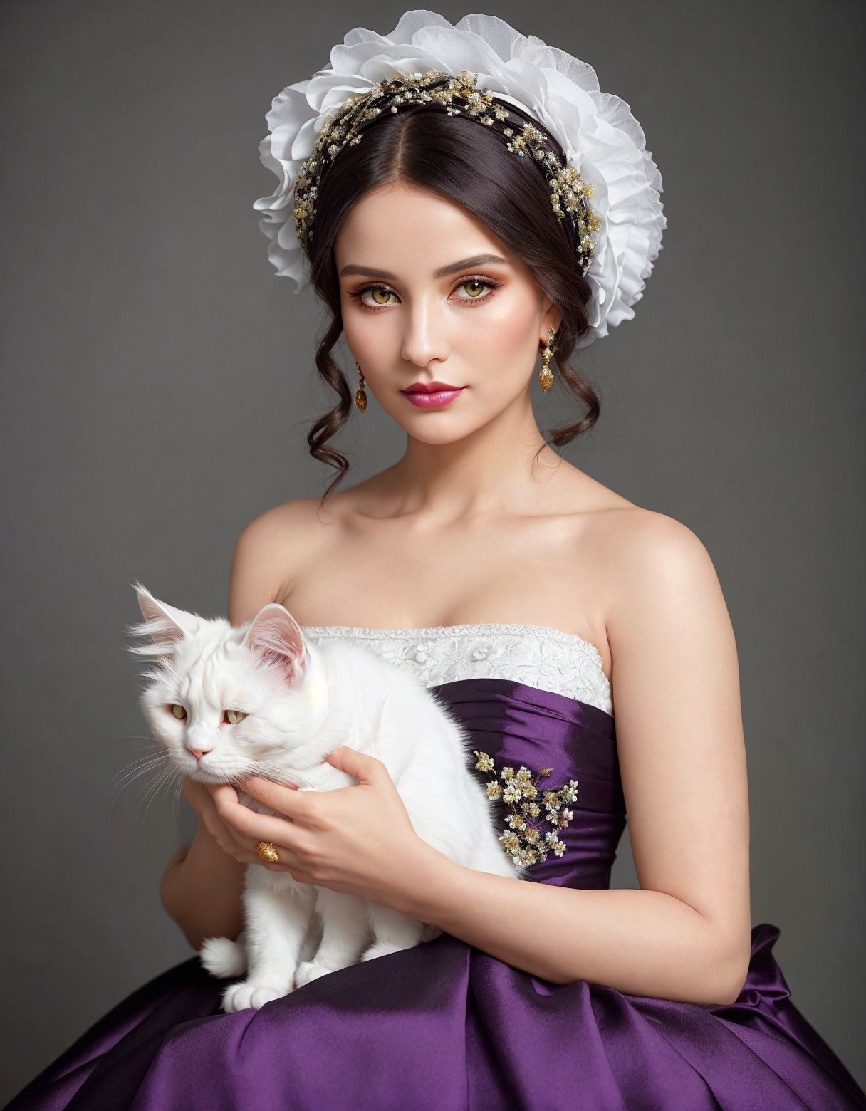 Purple headscarf with white flowers, lila ruffled dress, white Maine Coon cat, black and gold Renaissance drapery background, elegant theme, cold tones, soft expression, white lipstick, subtle eye makeup, direct gaze, gentle hand on chin, detailed and sharp focus, realistic with a touch of fantasy, cold color palette of purples, whites, golds, and blacks, rich and luxurious textures, Renaissance-inspired style, regal and sophisticated ambiance. {8k resolution; trending on artstation; maximalist; uncanny; highly detailed and intricate, hi-res, photorealistic, Nikon Z9, 85mm F1.2, DOF, smooth and realistic HDR}]