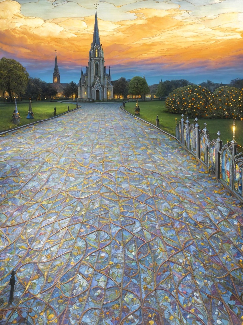 + Prompt:Poster art. Magic vision path. Surreal.Incredibly detailed and ornate. Realistically painted. Partially Church. Black and White with brilliant colors sporadically popping out. No people. Beautiful stained glass nightscape. Night setting. Vast beautiful stained glass fencing. No people. At night. Stained glass glowing light.