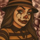 A captivating figure with striking makeup resembling a scarecrow, featuring bold lines and vibrant colors. Dressed in a striped shirt and a matching hat, she stands amidst a scenic backdrop.