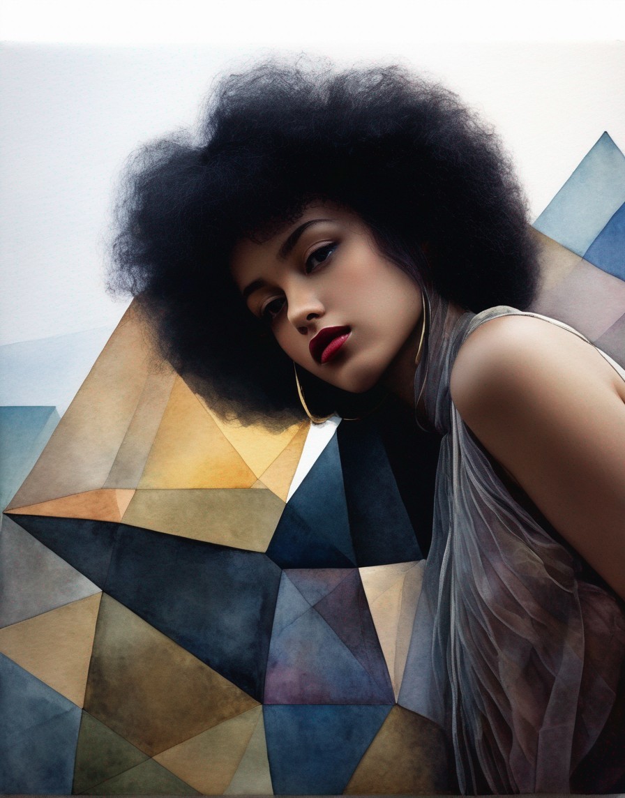 An artistic rendering of a woman with voluminous curly hair, a contemplative expression, against a geometric background.