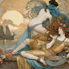 The image features two elegantly dressed women, one adult and one child, in ornate attire with intricate patterns. They are surrounded by a serene landscape, exuding grace and beauty.