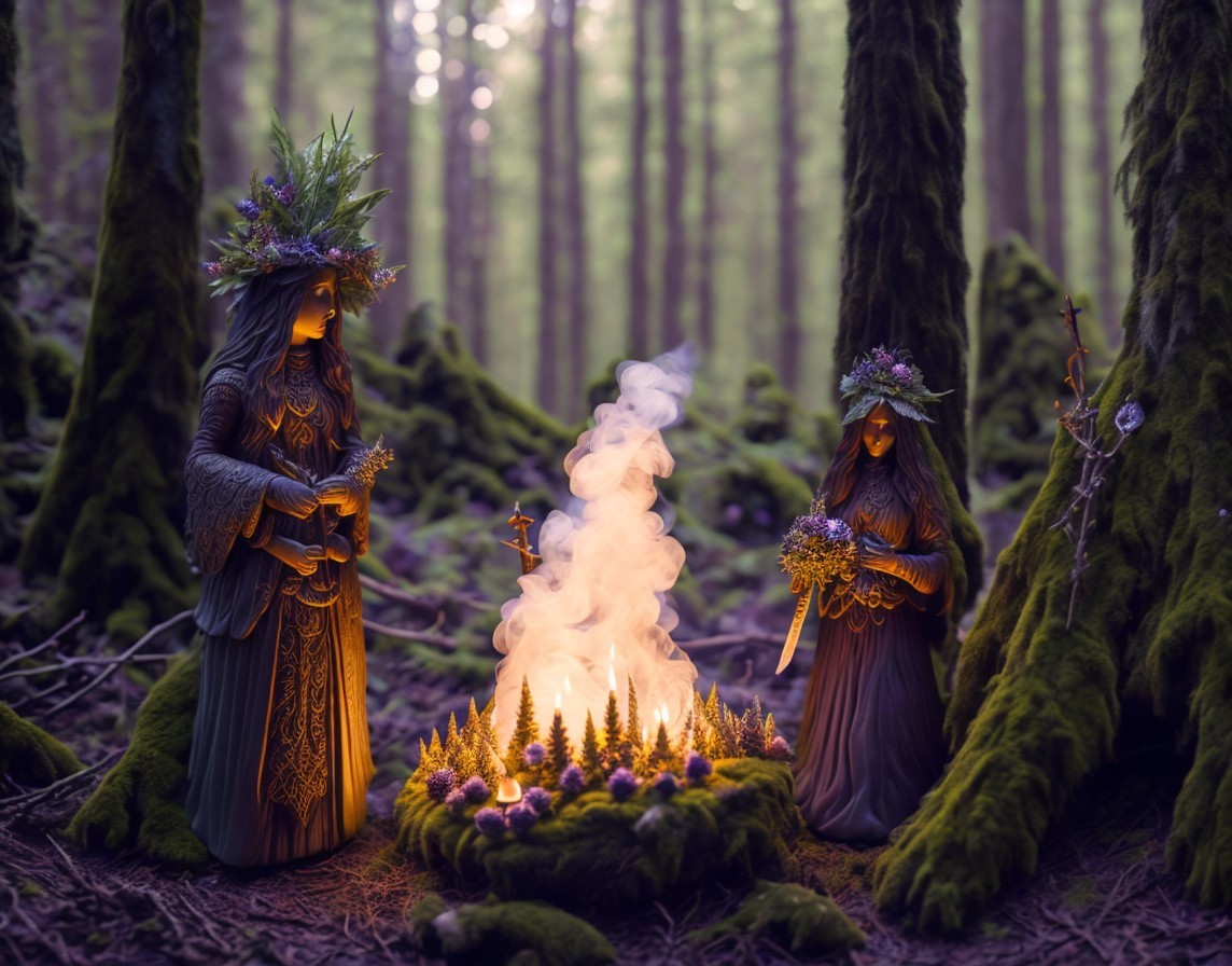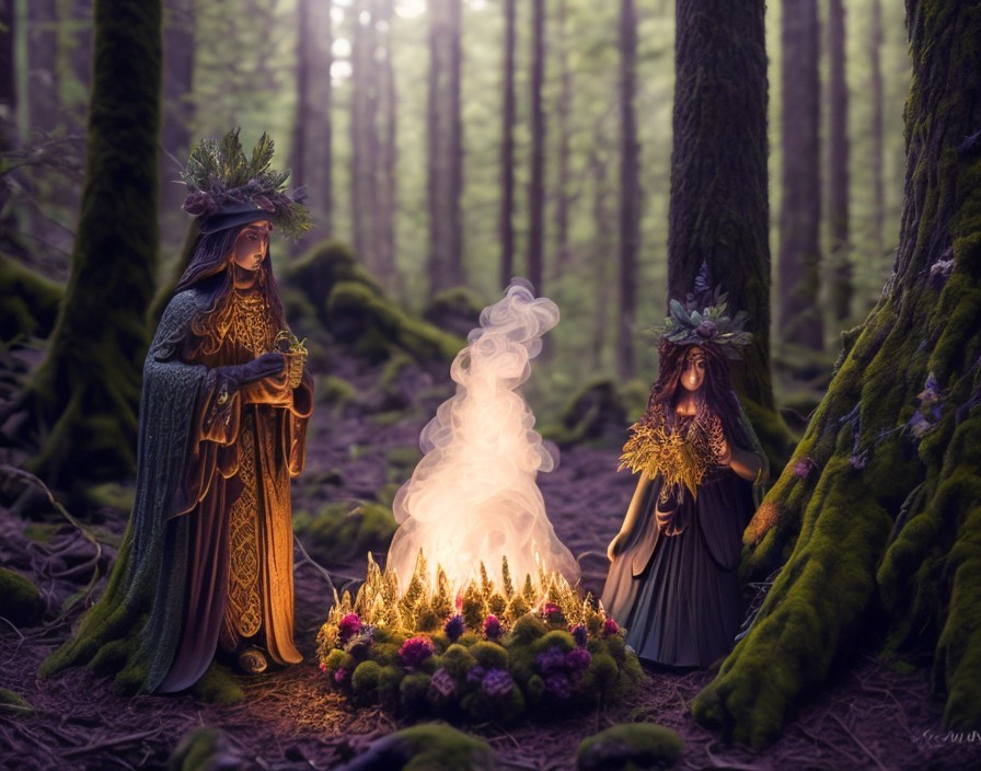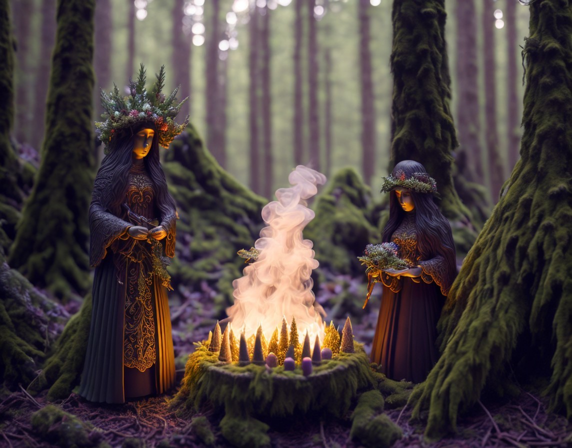 Two robed figures with floral crowns stand by a small fire in a mystical forest setting, surrounded by candles and moss.