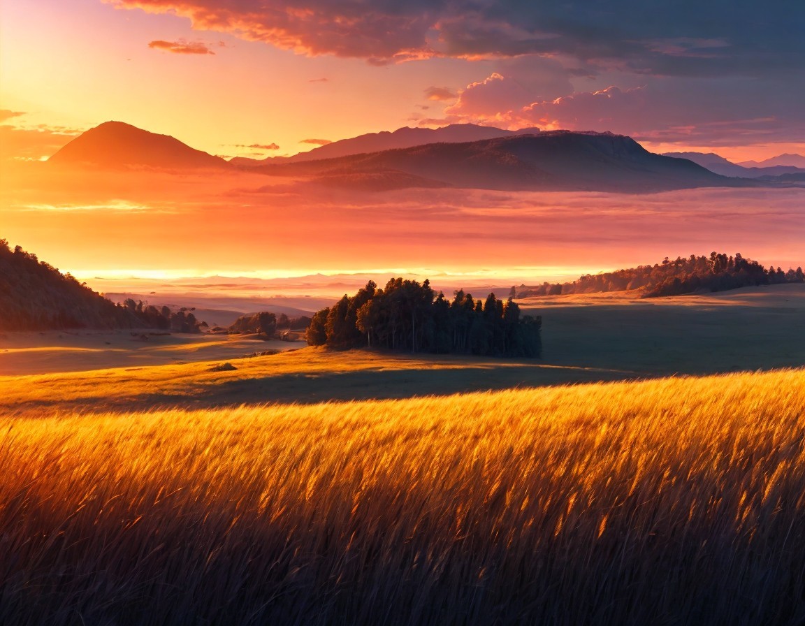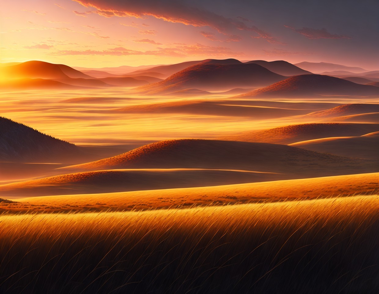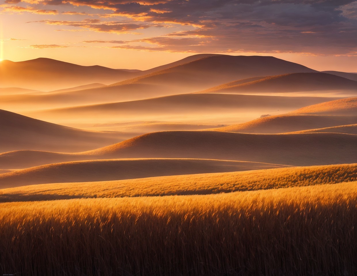 Prompt: "We arrived in the new world at sunset on a broad hilly savannah covered in tall wild grain grasses and surrounded by distant mountains, pristine grassland wilderness, crepuscular low angle golden red sunlight at dusk, mighty distant clouds, epic vista"