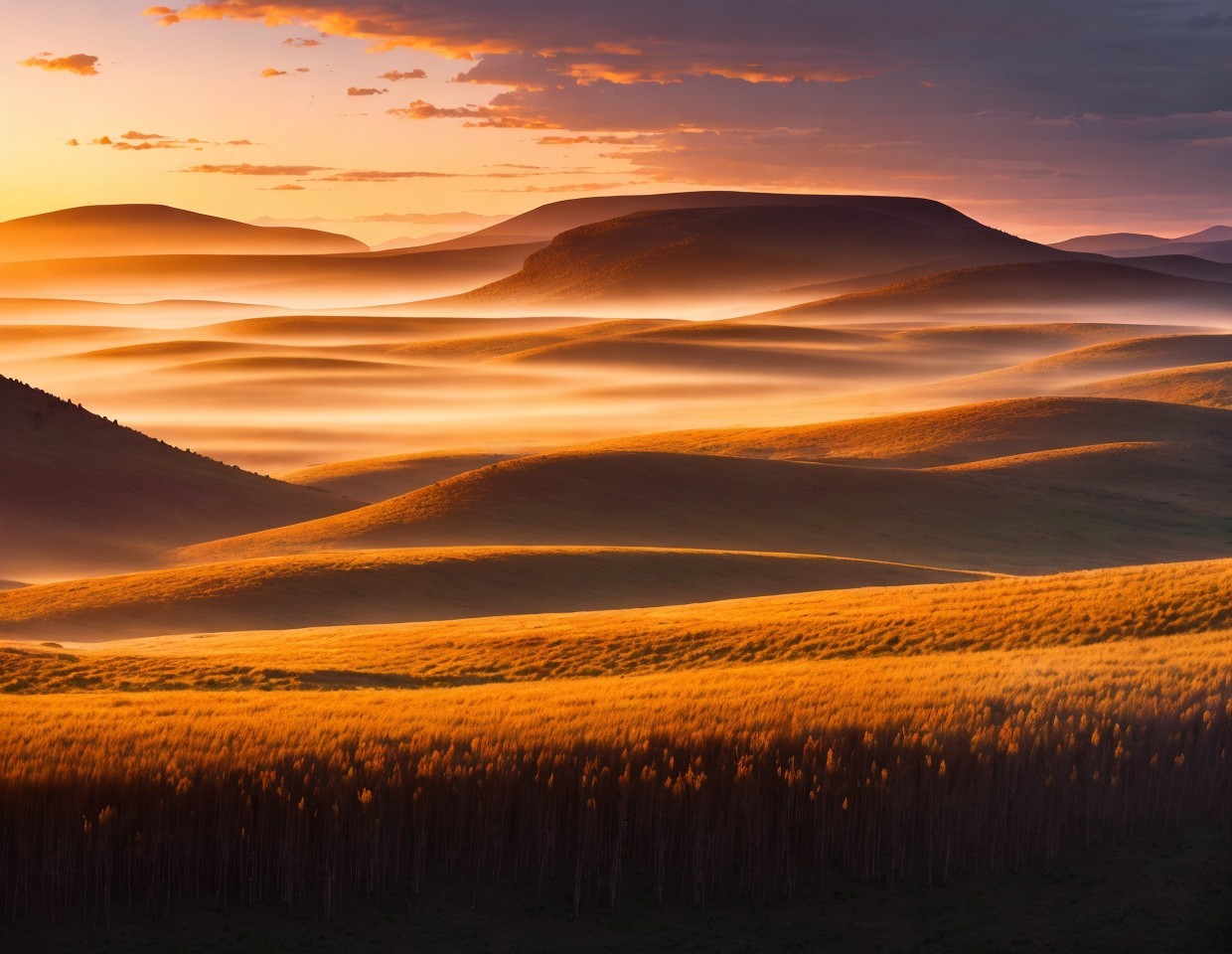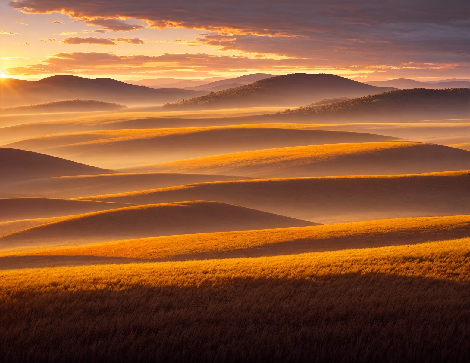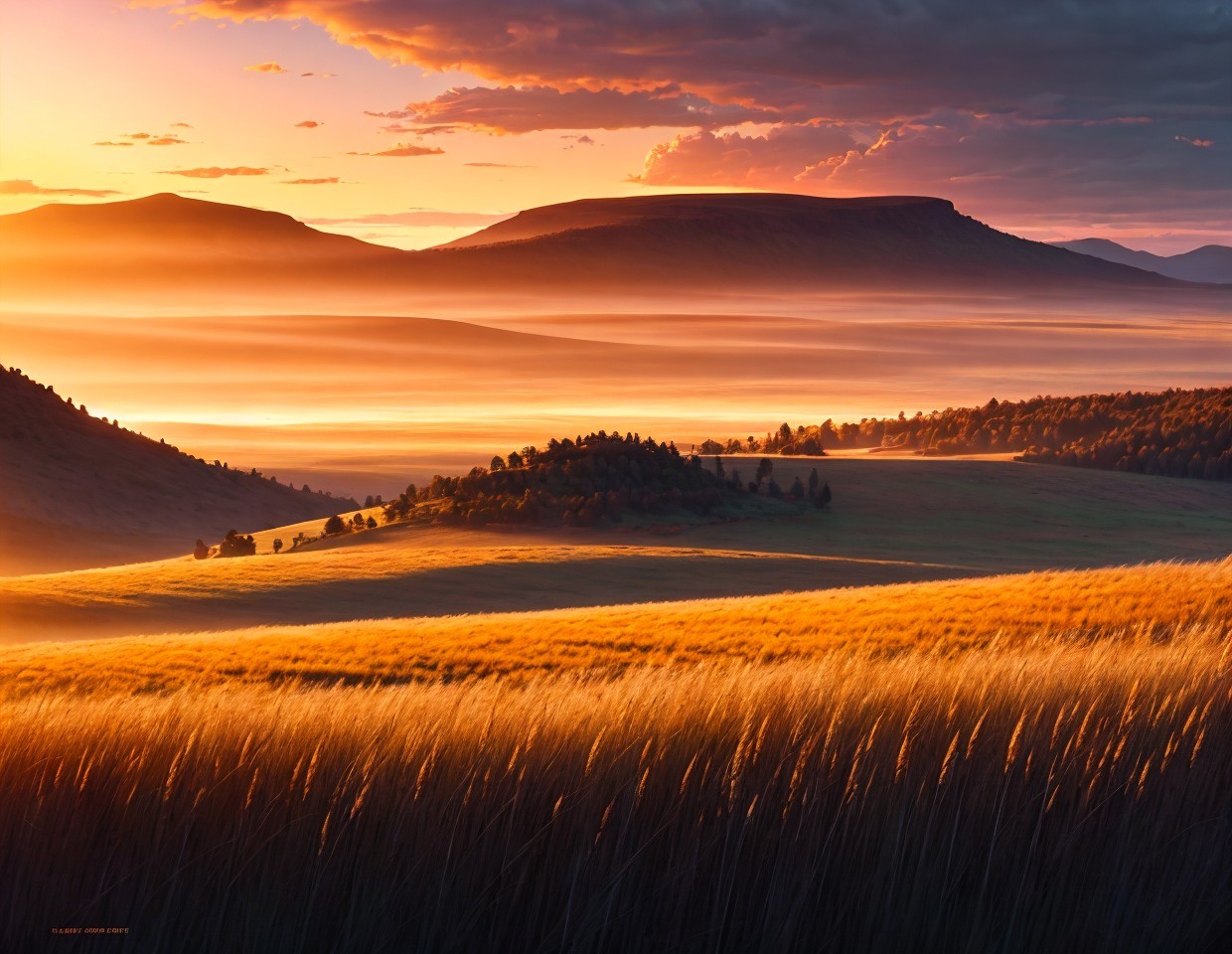 Prompt: "We arrived in the new world at sunset on a broad hilly savannah covered in tall wild grain grasses and surrounded by distant mountains, pristine grassland wilderness, crepuscular low angle golden red sunlight at dusk, mighty distant clouds, epic vista"