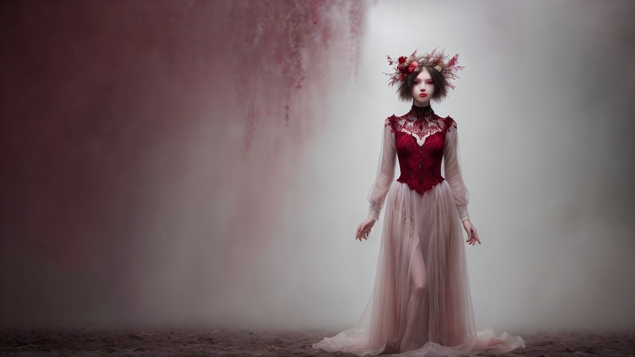 (Try from marek zarnovicky) - A ethereal figure stands in a misty, enchanting forest. Dressed in a flowing gown with red and floral accents, the atmosphere is mysterious and dreamlike, evoking a sense of fantasy.