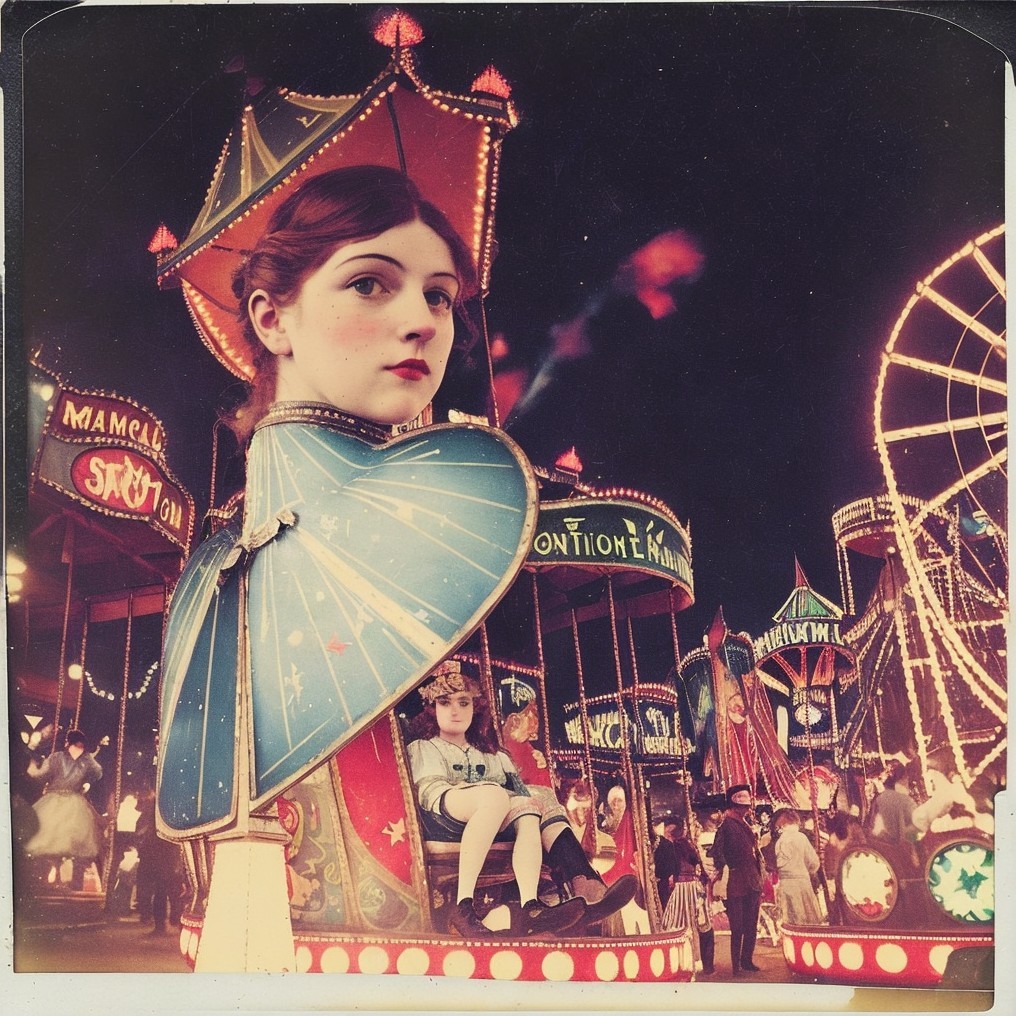 A vintage-style photo of a bustling fair with a large female figurehead, carousel, and people in period clothing.