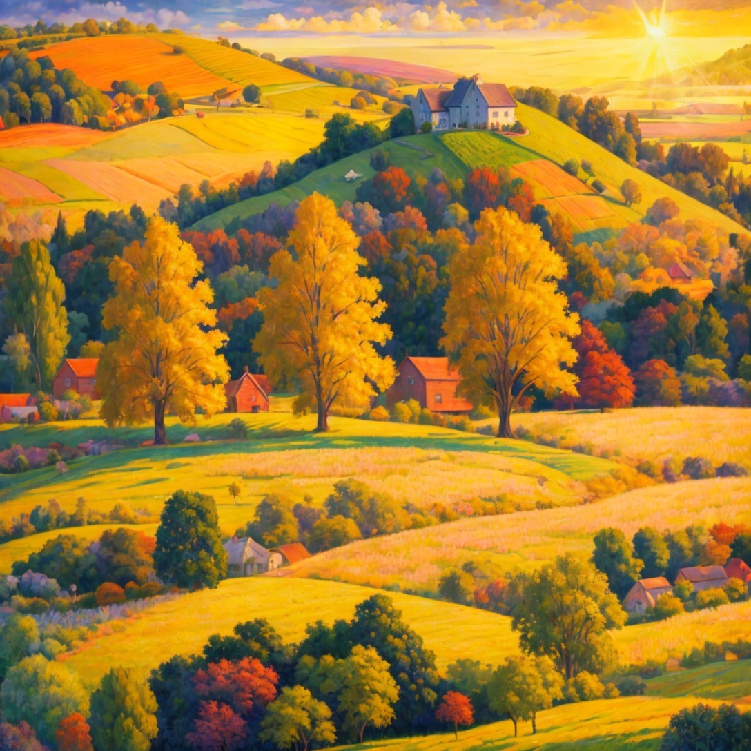 A vibrant rural landscape at sunset with golden sunlight bathing rolling hills, colorful trees, and quaint farmhouses.