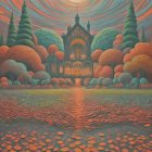 A surreal landscape features an ornate structure framed by vibrant, oversized trees. Warm hues of orange and gold dominate, with a serene sunset reflected in a river of fallen leaves.
