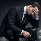 A brooding man in a suit squats atop a pile of stones, holding a chain. Dollar bills float around him, symbolizing entrapment or the burden of wealth in a dark, shadowy background.