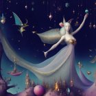 A surreal scene featuring an ethereal figure draped in flowing fabric, surrounded by whimsical creatures, floating ornaments, and enchanting landscapes, evoking a dreamlike atmosphere.
