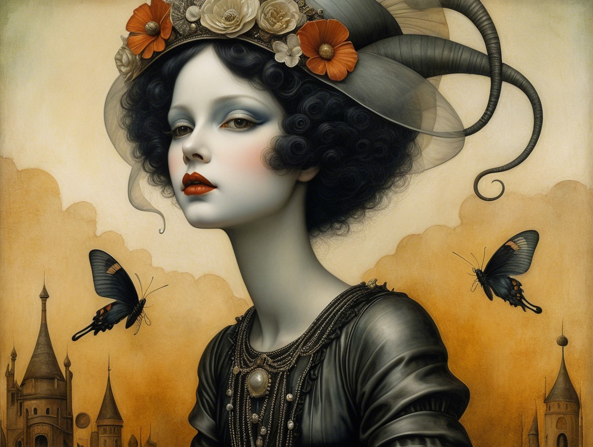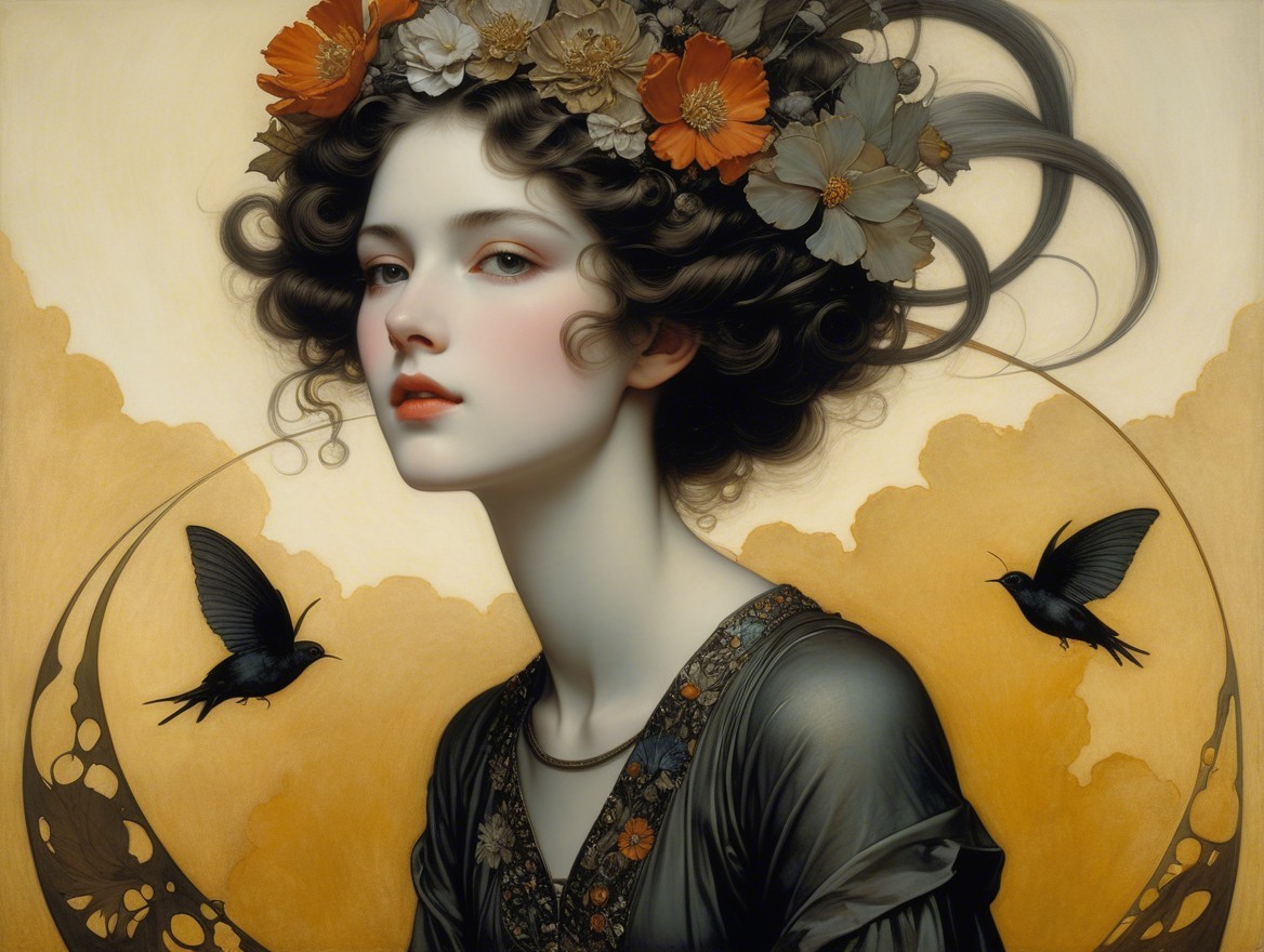 The image features two elegant women with flowing dark hair, adorned with intricate jewelry. They are surrounded by celestial motifs and gears, creating a dreamy, cosmic atmosphere.