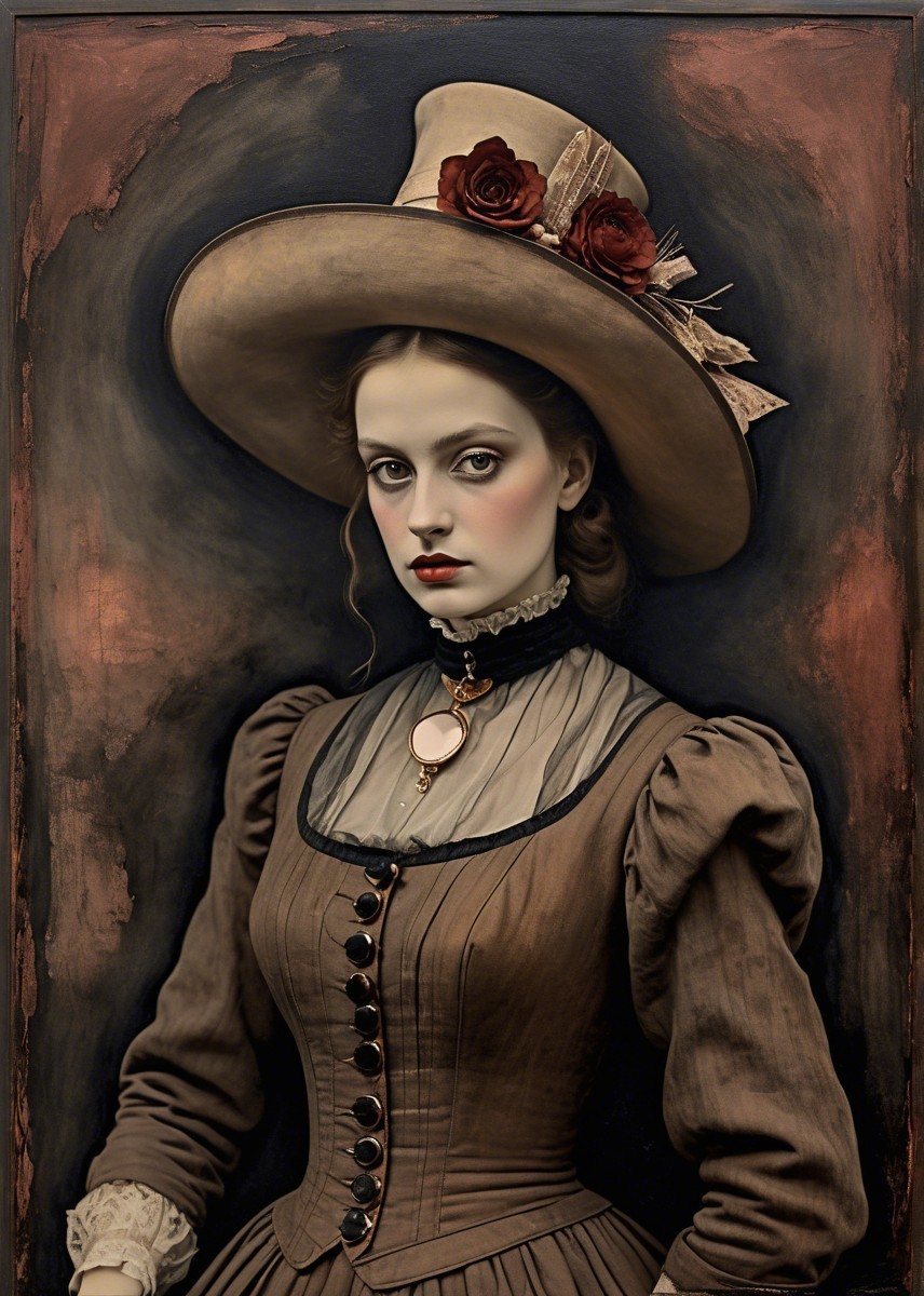 Alice in wonderland.foggy nostalgia, portrait in Burnt umber and rose gold, smoke and mirrors, patina of, battery acid, art brut, moody, somber, desaturated colors, in the style of Paul Klee, Arthur Rackham Dark and moody oil painting of a woman with piercing black eyes, inspired by the works of John Singer Sargent and Edgar Degas, long shot, realistic texture, dramatic lighting, intricate details on clothing and Magical woman fading tones of melancholy and summer nostalgia, soulful portrait, in burnt umber, plutonium, patina of mercury glass, tea stains, art brut, moody, somber, desaturated colors, in the style of Paul Klee, Banksy, Arthur Rackham, based on Prompt by KRW