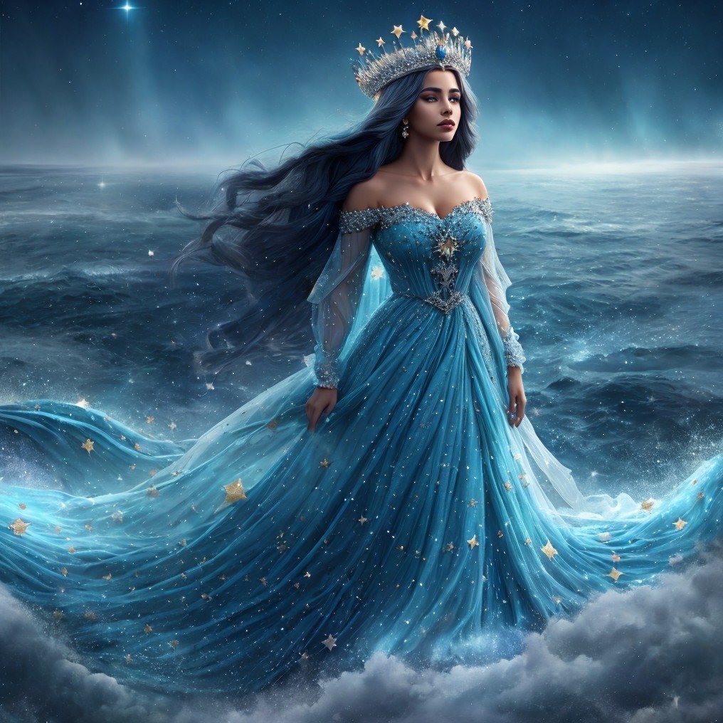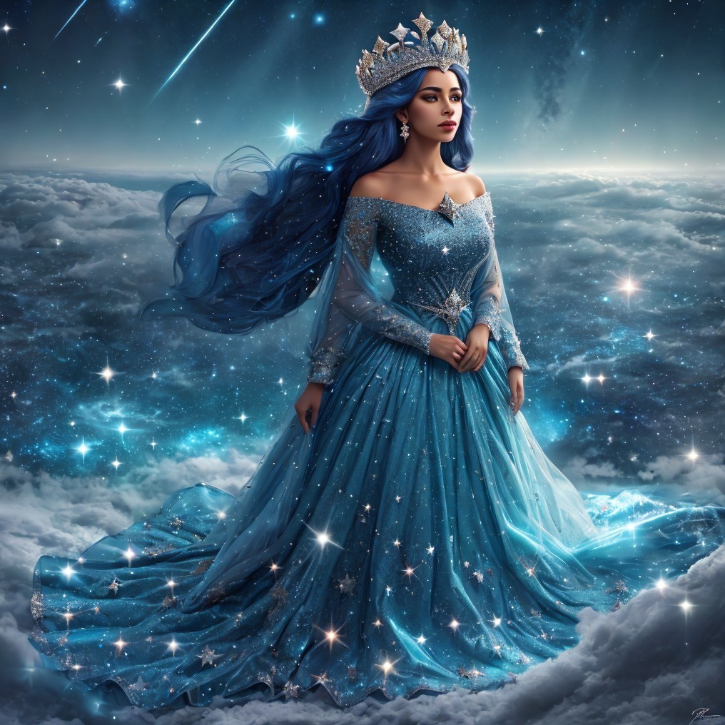 Regal figure in sparkling blue gown against snowy mountain backdrop