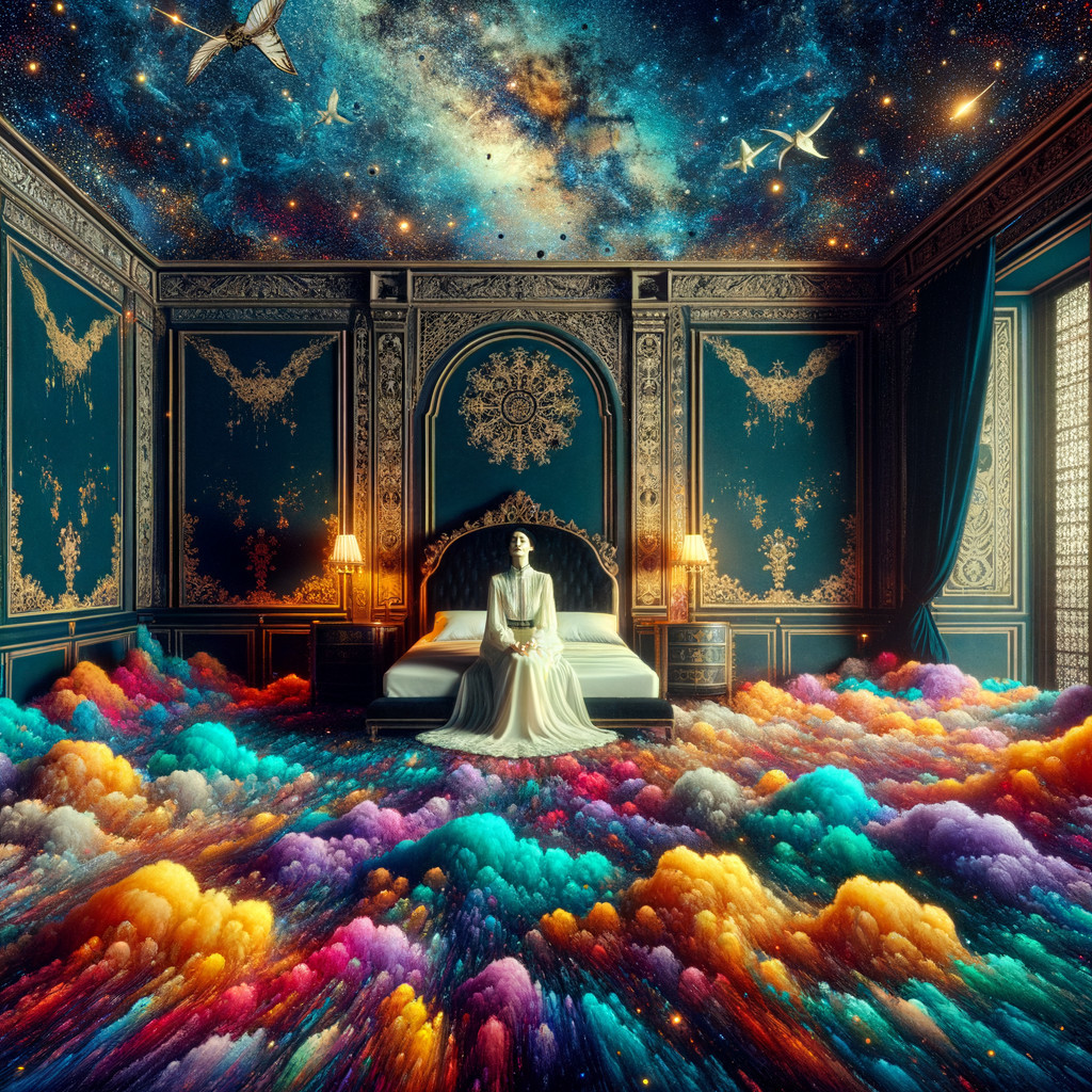 Prompt: "extremely beautiful woman sitting on her bed in bedroom, open ceiling for starry sky above, colourful clouds below, splash art Luis Royo, Victo Ngai, Alberto Seveso, digital art, detailed background, hyper-realistic, hyper-detailed, dreamy, moody, ethereal, splashes of colour, realistic, hyper-realistic, award jenny saville, edward hopper, surrealism, dark art by james jean, takato yamamoto,, ultra hd, realistic, vivid colours, highly detailed, UHD drawing, pen and ink, perfect composition, beautifully detailed, insanely detailed octane render trending on artstation, soft natural volumetric cinematic perfect light."