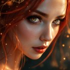 A stunning portrait of a young woman with flowing, wavy hair, adorned with delicate accessories. She has captivating eyes and a soft expression, set against a shimmering, warm background.