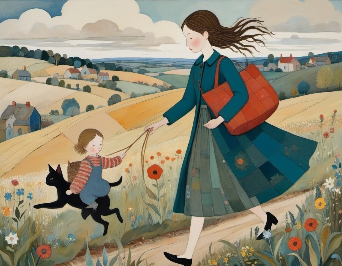 Prompt: "masterpiece, war, child and mother fleeing from shelling, the child is holding a small cat, whimsical figures, in the style of Quentin Blake and Dee Nickerson, rough patchwork, whimsical shapes."