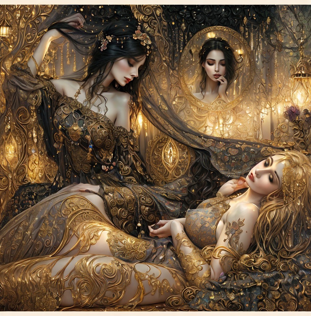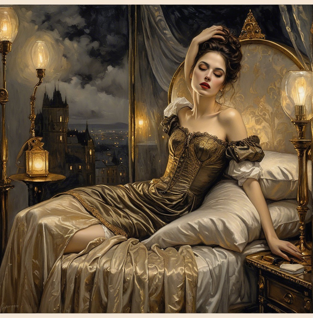 A woman with elegant features sits on a bed, wearing a luxurious gold gown. Soft lighting from vintage lamps casts a warm glow, enhancing the intimate atmosphere of the richly decorated room.