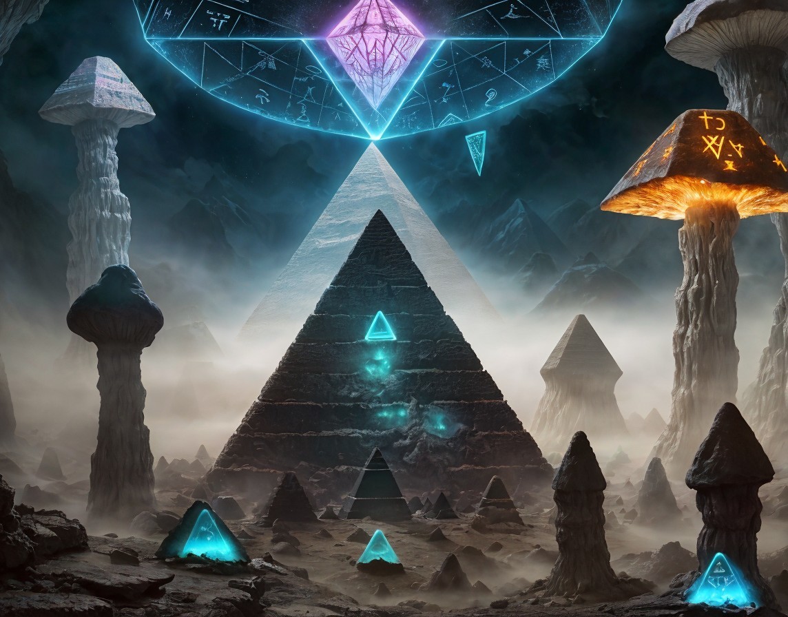 A mysterious sci-fi landscape with glowing pyramids, alien mushrooms, and a levitating crystal above.