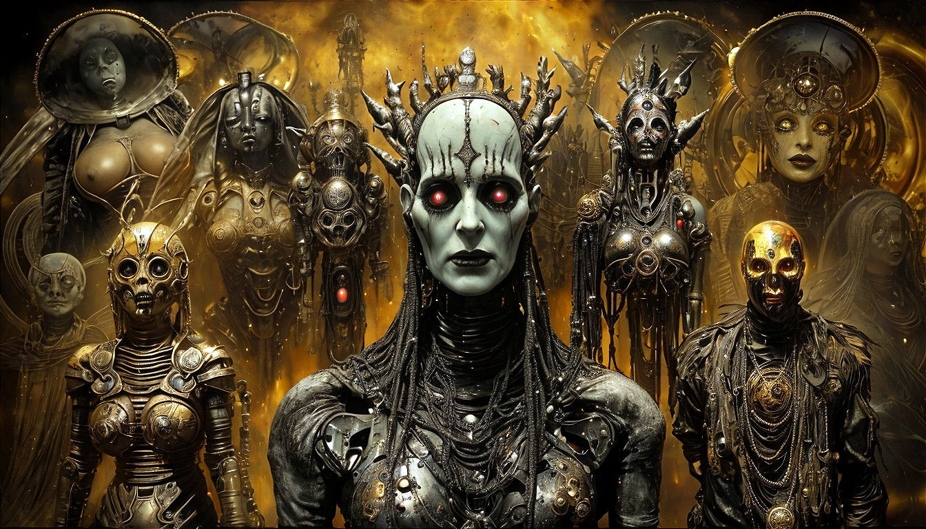 + Prompt:All on one image: Effects of heat on celluloid, cenobites and warlock, cybernetic disaster witch of evil, inspired by Clive Barker and H.R. Giger weirdness, flesh and gold brassiere,cosmic colorful background , wet collodion process of style of emil melmoth and by roger ballen, medium - format print, The wonderful work by Shintaro Kago, by Alexander Runciman, ffffound, nuclear radioactive particles, made of crystalized synapse, nineteenth century, artforum, goya, , Roberto Ribeiro Padula
