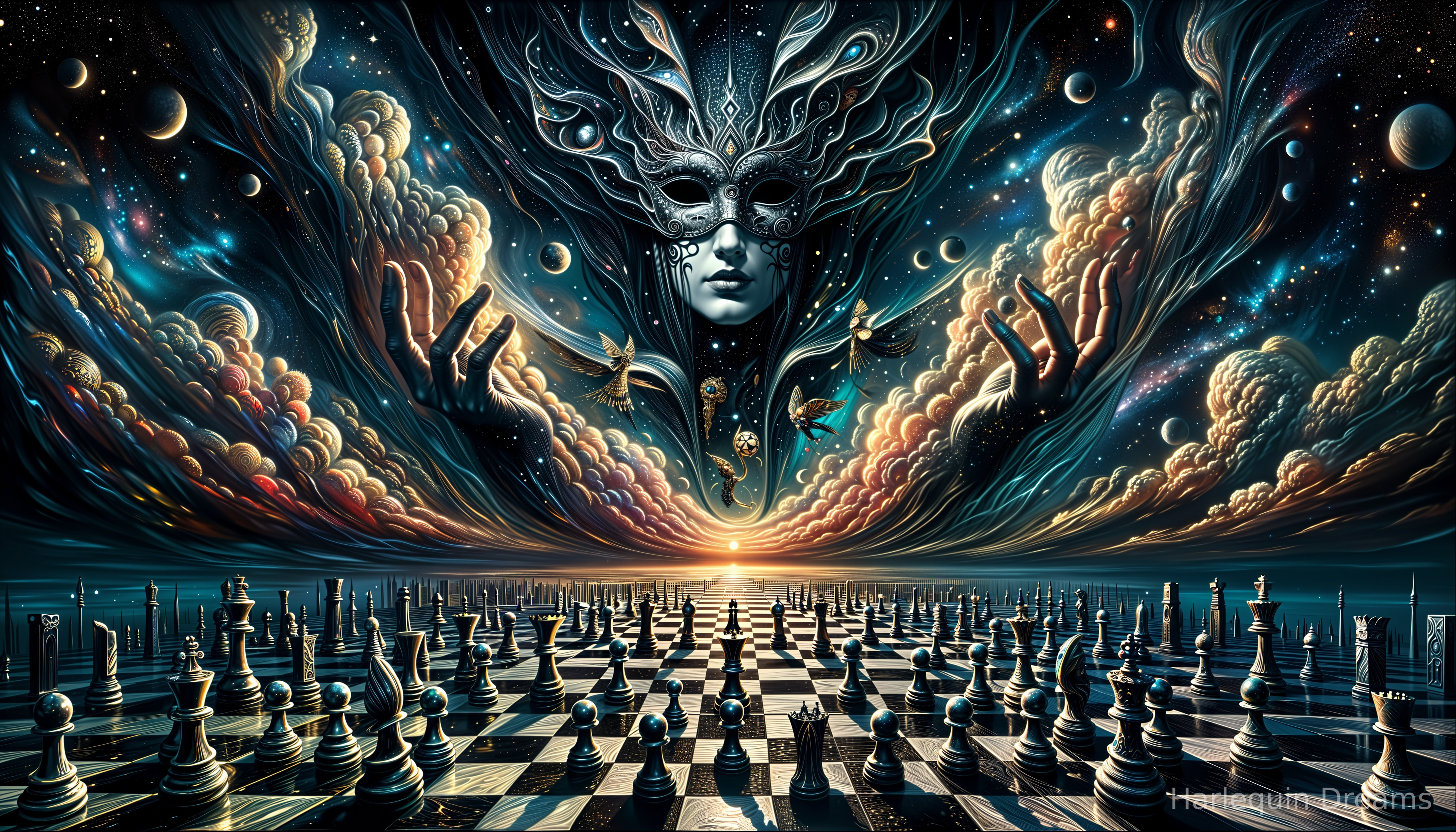 A surreal artwork with a cosmic chessboard, ethereal face in space, clouds, sunset, and celestial bodies.