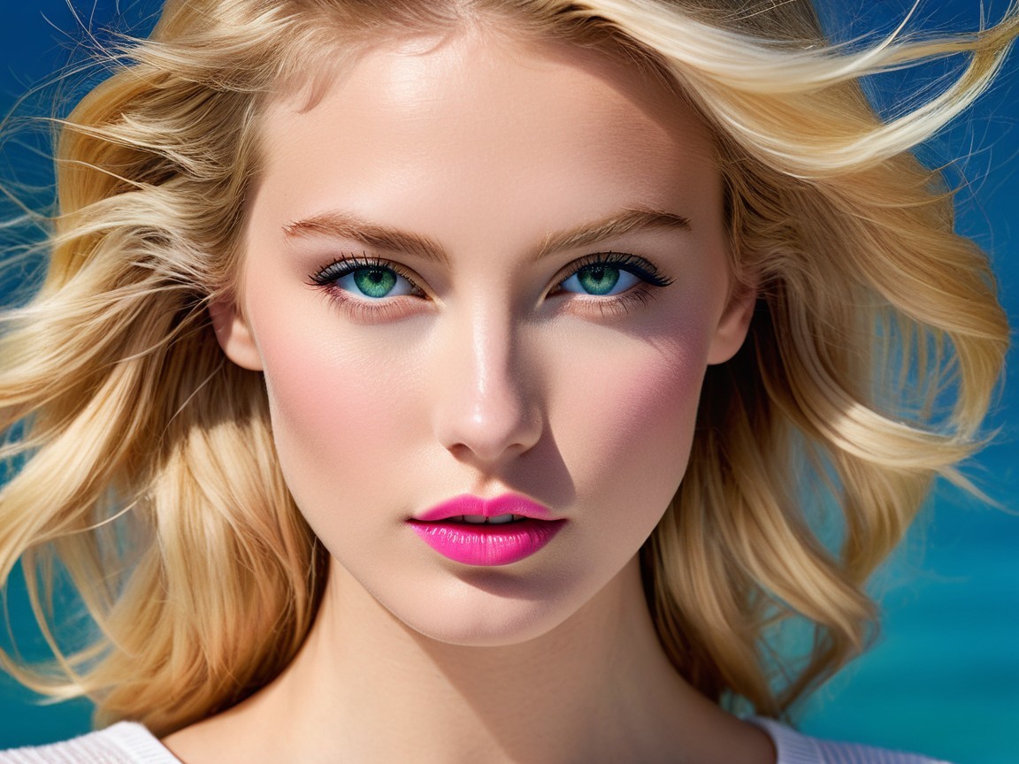 A close-up portrait of a young woman with long, flowing blonde hair and striking aqua-blue eyes. She has a natural glow, soft pink lips, and a serene expression against a vibrant blue background.