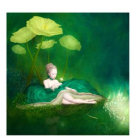 A doll-like woman with pale skin, reddish cheeks, and red lips, wearing a white ruffle-shouldered top and a white skirt with a green underskirt, sits in a meditative pose on a giant bright green lily pad in green water. She holds an open dark green book in her