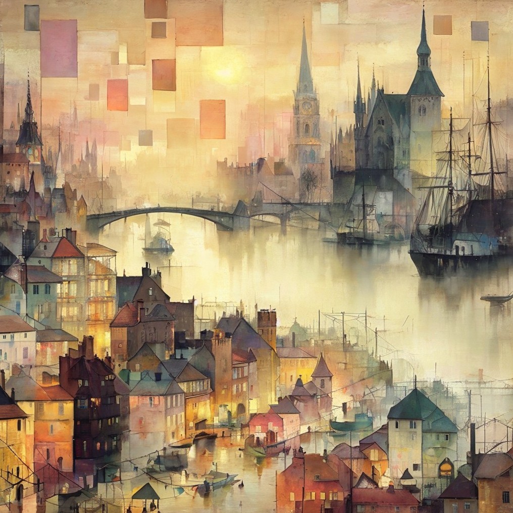 A colorful, dreamlike cityscape at dawn, featuring whimsical buildings, a serene river, a bridge, and tall spires. Soft hues blend to create a tranquil, atmospheric setting.