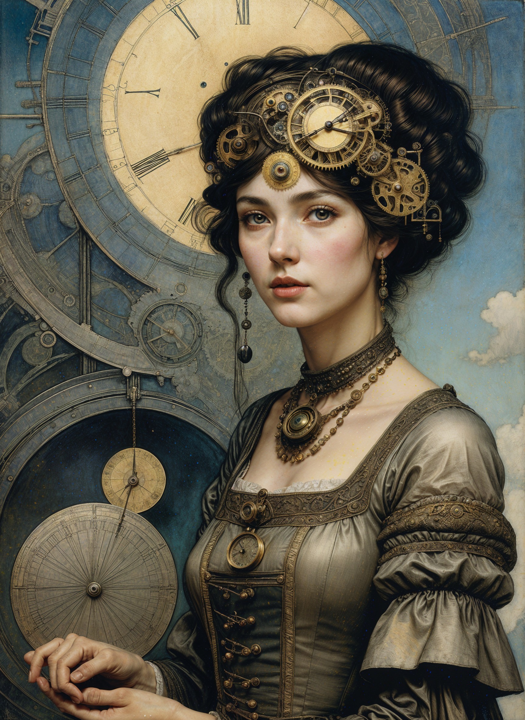 A elegant woman with ornate clockwork accessories gazes thoughtfully, surrounded by celestial motifs and a moonlit backdrop, blending steampunk elements with ethereal beauty.