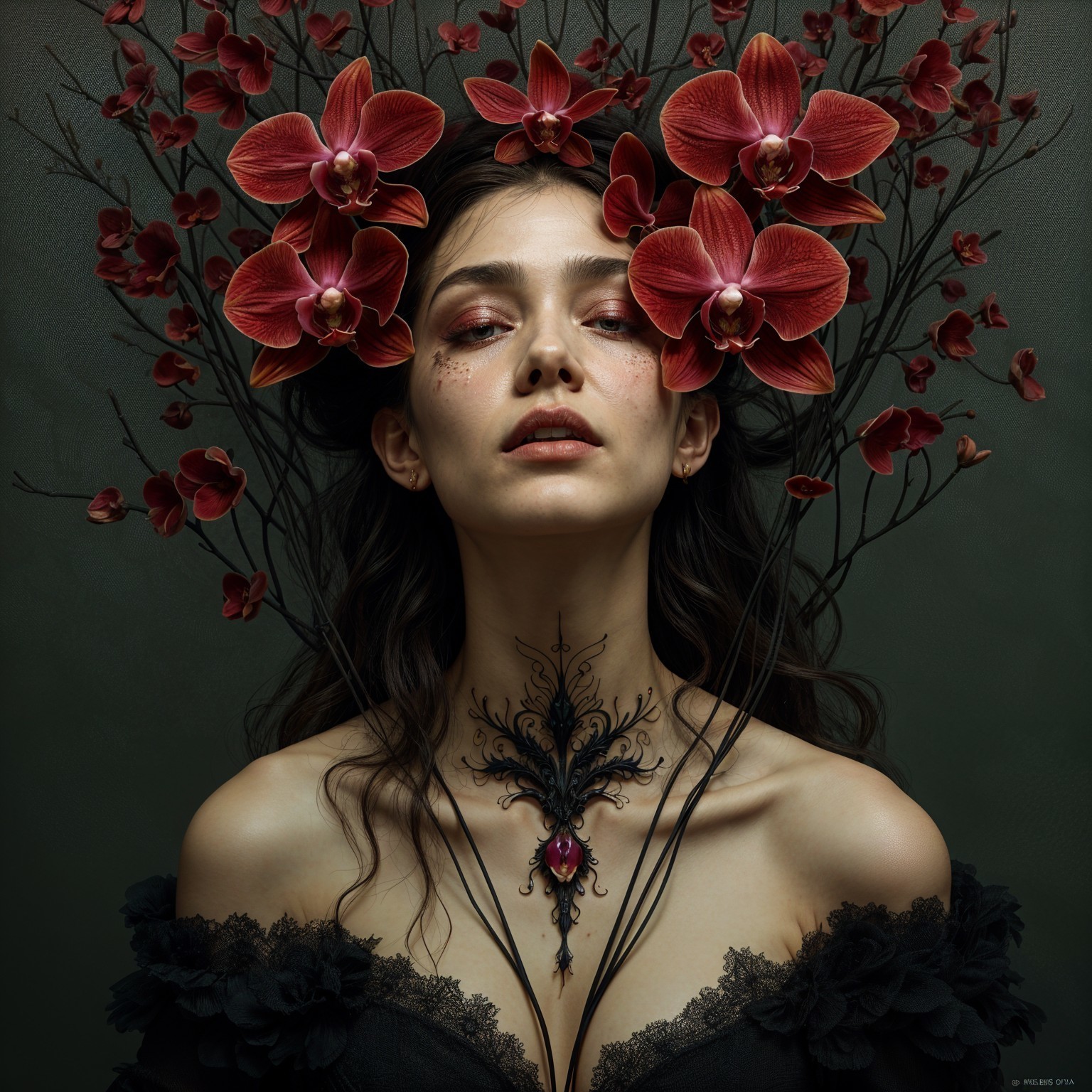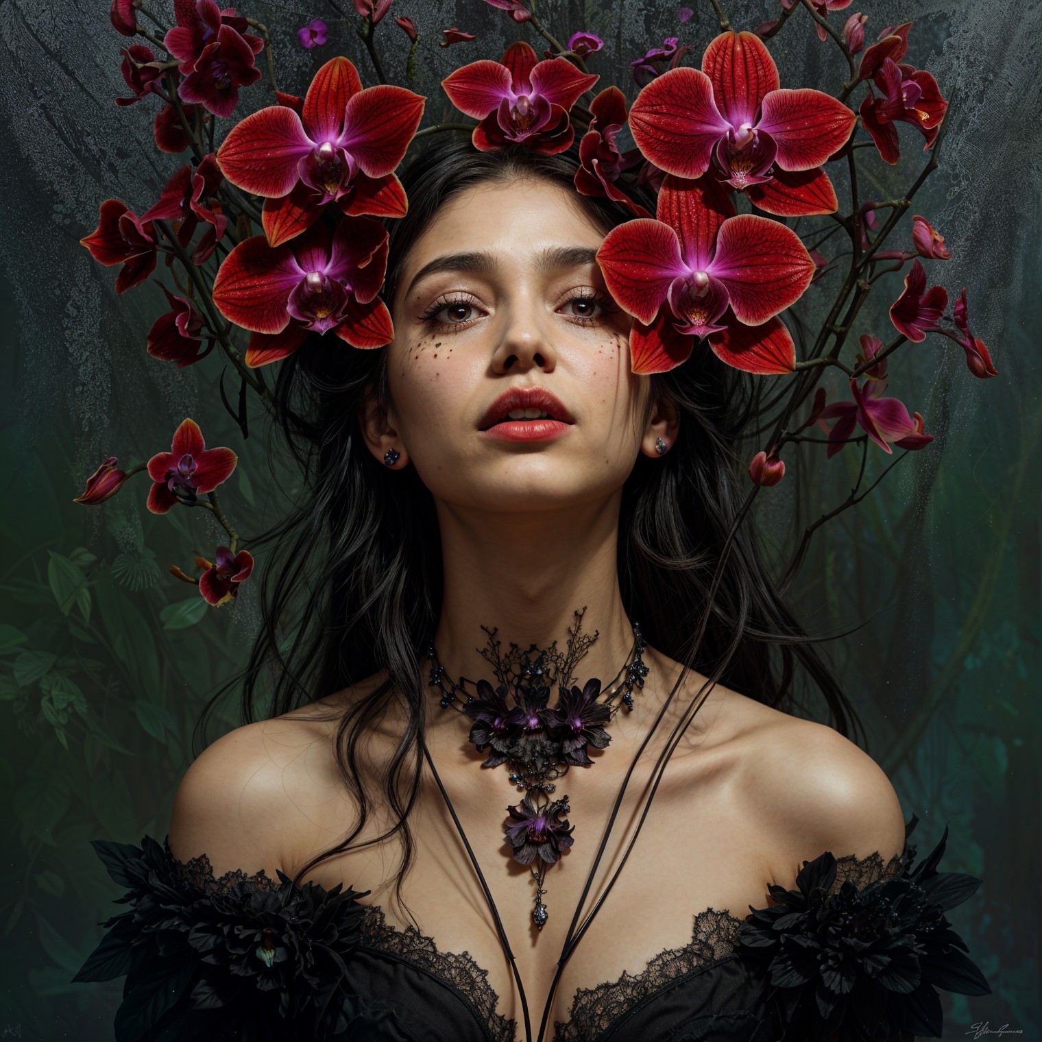 A captivating woman with dark hair adorned with vibrant red orchids. She wears an intricate necklace and a striking black gown, exuding an aura of mystery and elegance in a lush, shadowy setting.