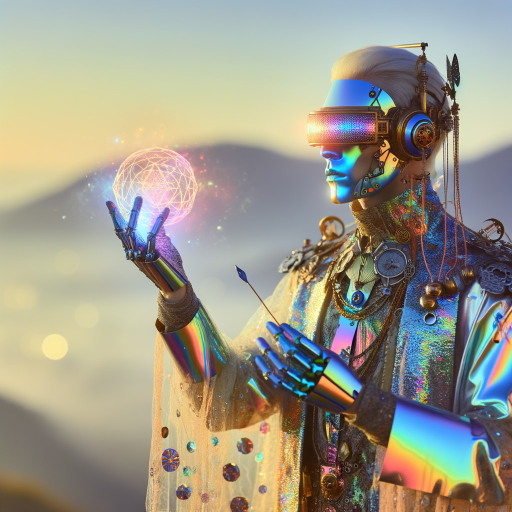 A futuristic figure holds a glowing disco ball, wearing a reflective outfit with metallic accents and stylish sunglasses. The backdrop features a hazy landscape at sunset, adding a vibrant atmosphere.