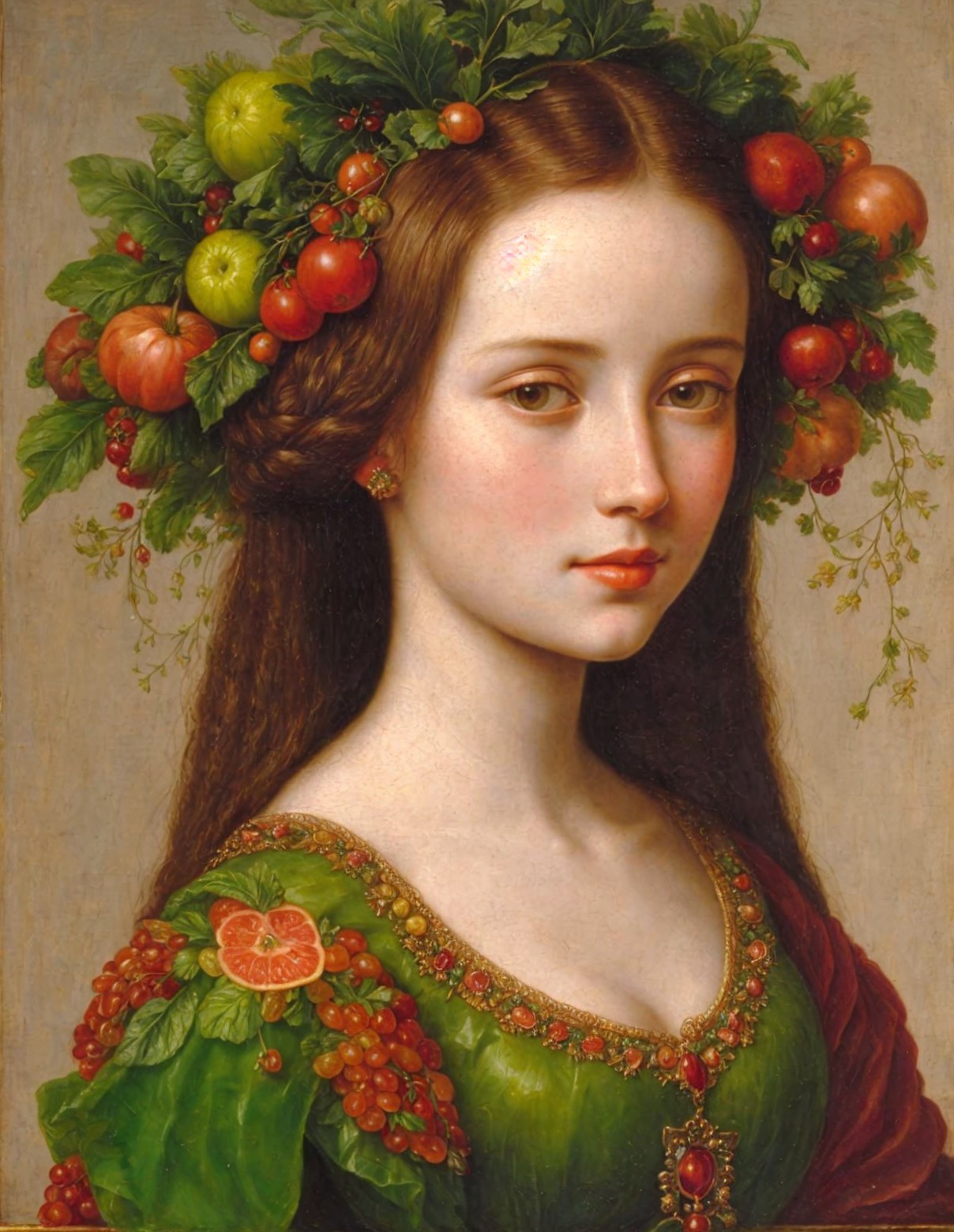 + Prompt:: PORTRAIT of a beautiful girl of the 16th century, composed of vegetables, fruits, plants, a painting by the Italian artist Giuseppe Archimboldo, detailed
