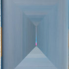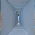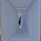 A person walks through a long, white corridor draped in fabric, creating a minimalist and ethereal atmosphere. The space is bright, emphasizing the simplicity and openness of the design.
