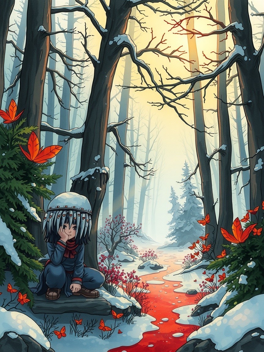 A serene forest scene features a fairy with delicate wings sitting by a shimmering stream. The trees are bare, surrounded by autumn leaves, while soft light filters through the branches.