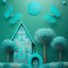 A whimsical house with teal accents stands amidst vibrant, surreal trees and lavender fields, under a glowing turquoise moon, accompanied by large, ethereal butterflies.