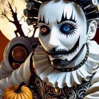 The image features a clown-like character with striking white face paint, bold black markings, and spiky blond hair, exuding an eerie yet captivating expression, enhanced by dramatic lighting.