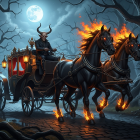 A sinister figure with horns drives a fiery, ghostly carriage pulled by two luminous black horses through a dark, moonlit forest. Eerie trees loom in the background, enhancing the spooky atmosphere.