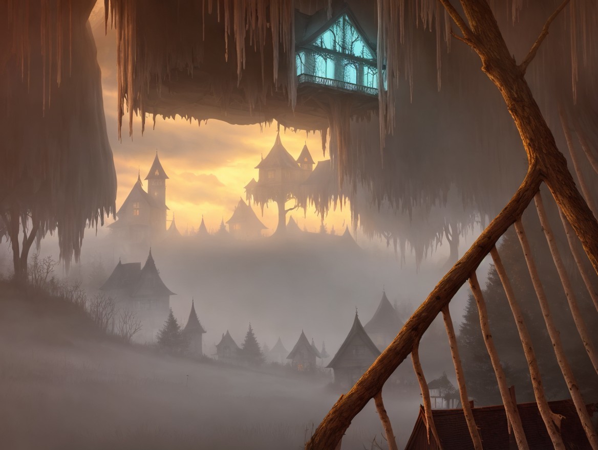 Ethereal foggy dusk landscape with silhouetted trees and quaint cottages.