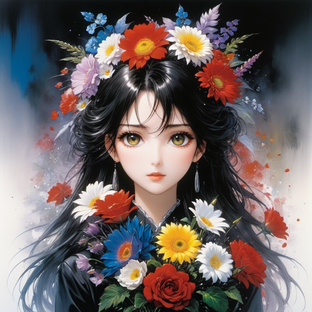 A painting of a woman with dark hair adorned with a vibrant floral crown, featuring detailed, colorful flowers and a dark background.
