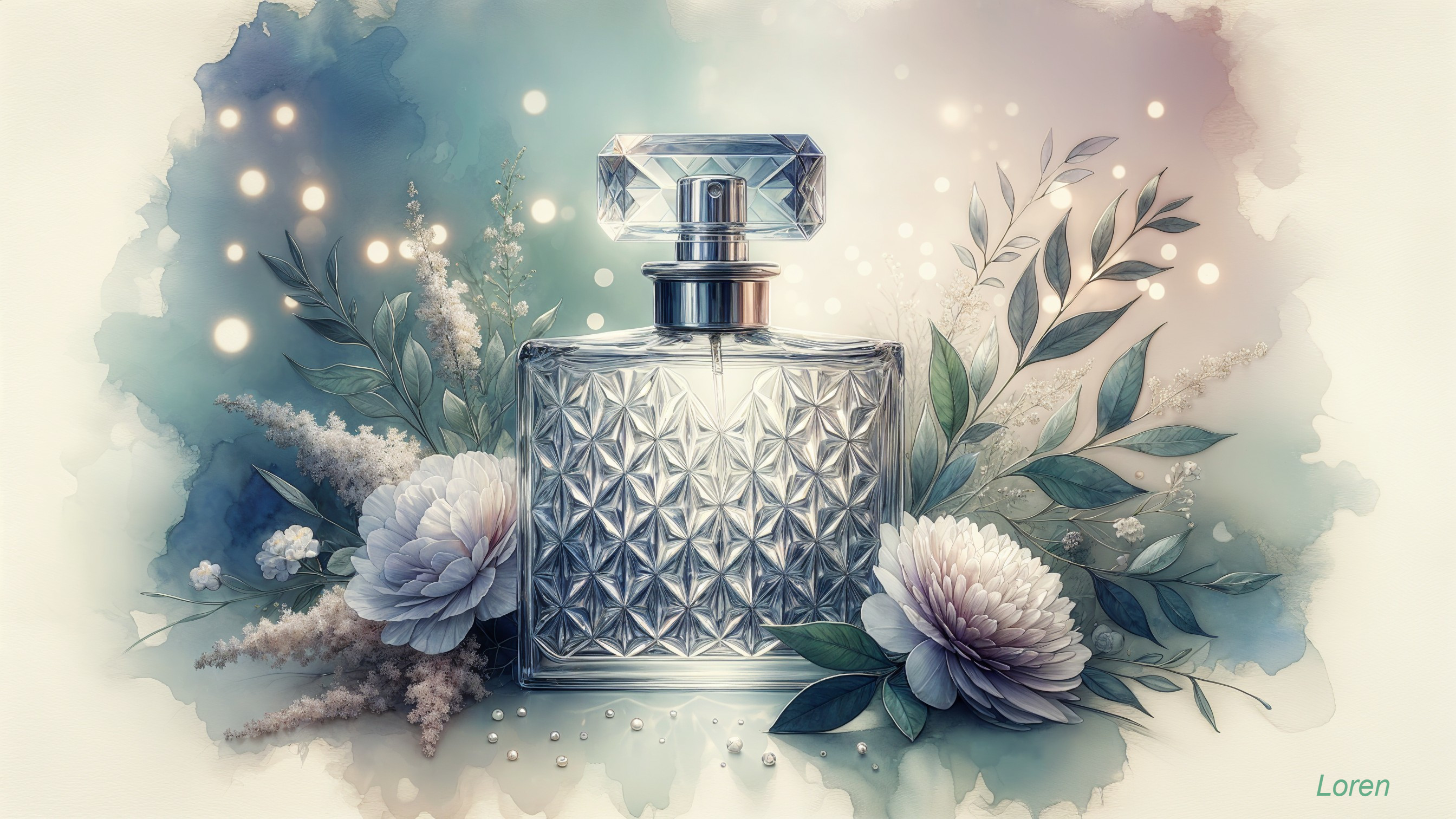 A beautifully designed perfume bottle is surrounded by delicate flowers and soft greenery, creating an elegant and enchanting ambiance with a dreamy, pastel background.